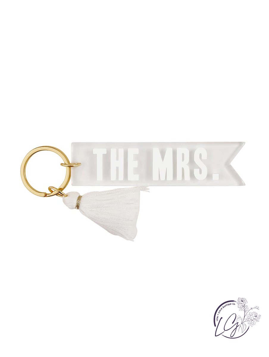The keychain features a sleek and clear acrylic surface that serves as the backdrop for the stylish inscription, "The Mrs." The text is skillfully engraved or printed, showcasing a sophisticated and timeless font that adds a touch of class to the overall design. The use of acrylic not only provides durability but also lends a modern and polished aesthetic to the keychain.