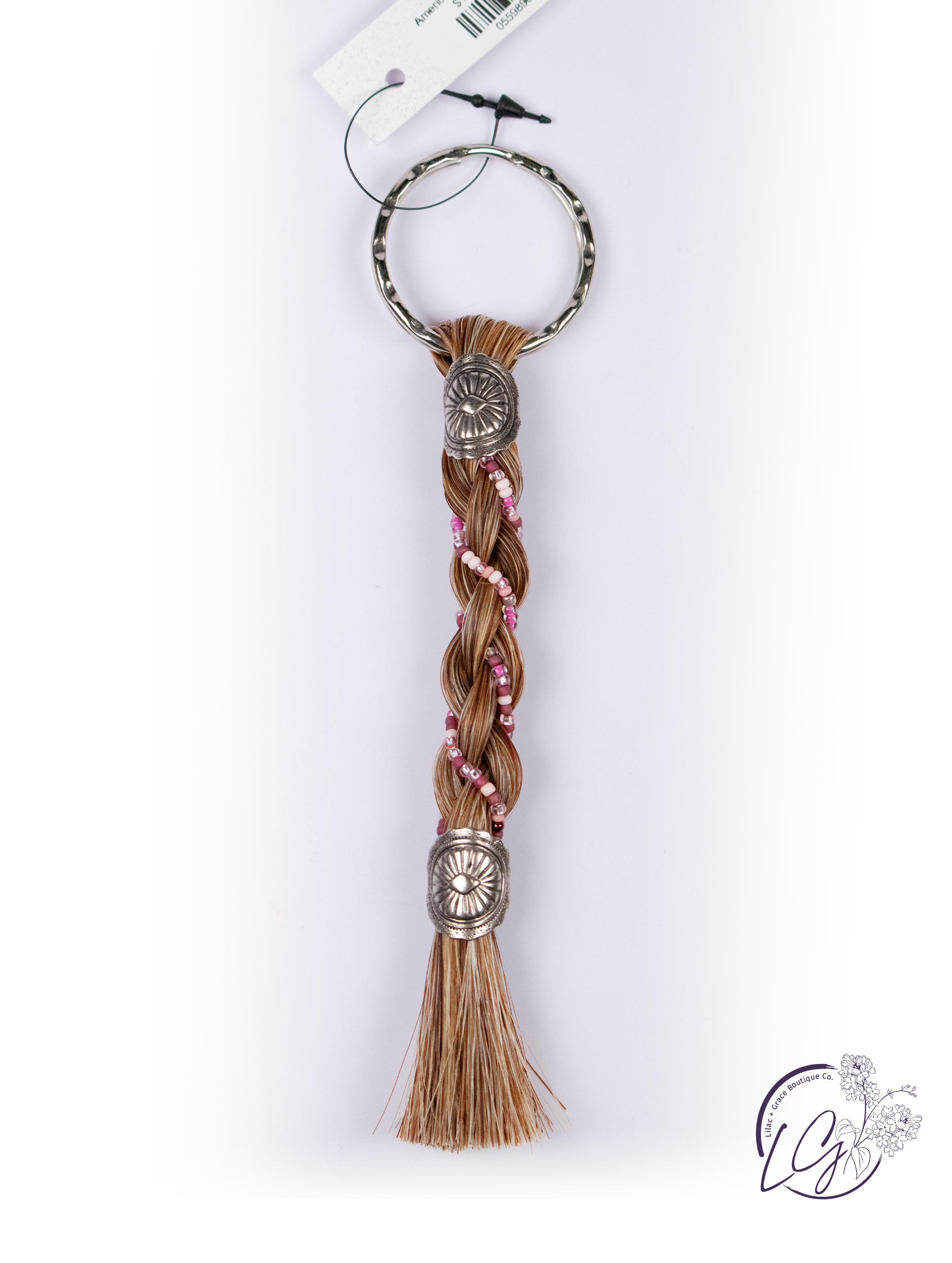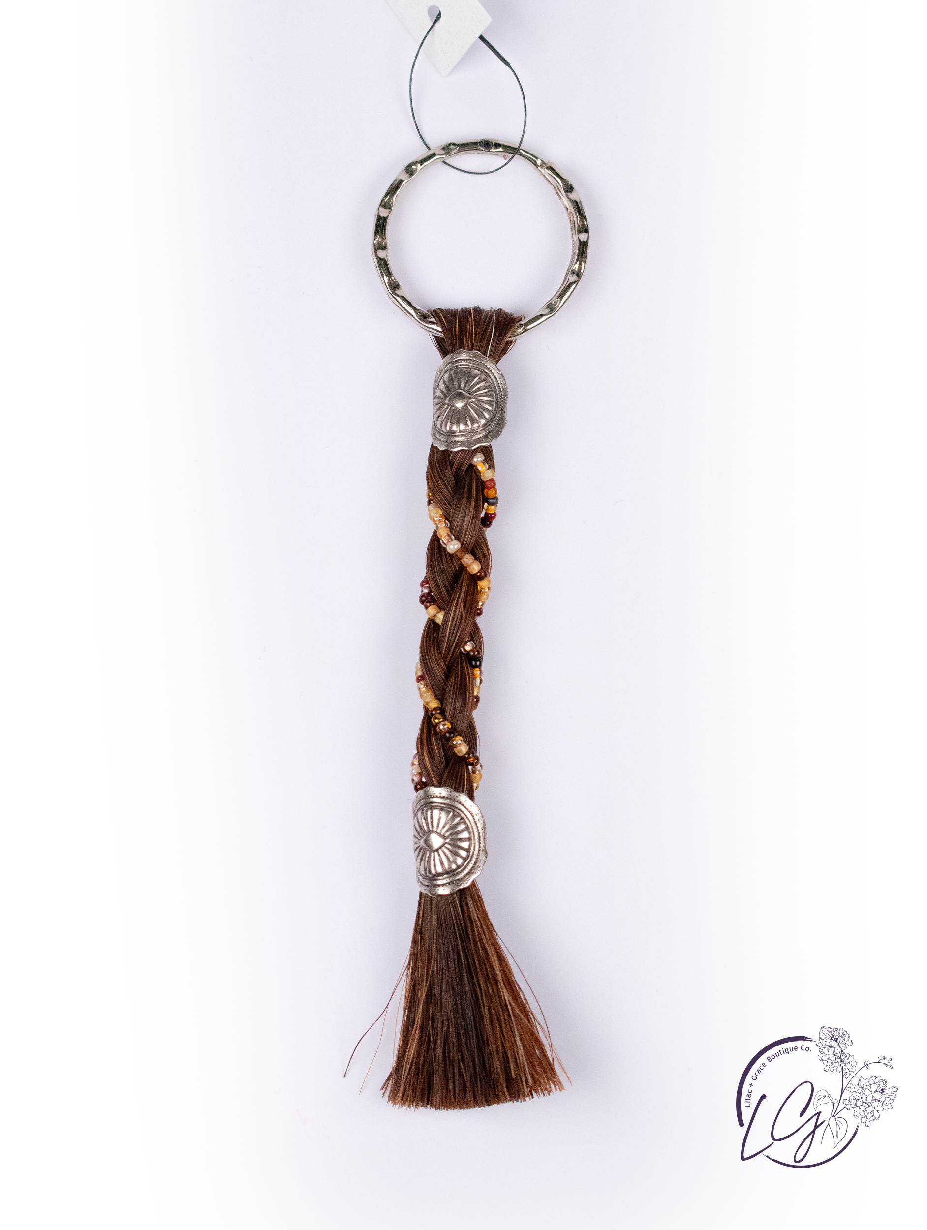 Be native with colorful seed beads that intertwine the spiral braid of horse hair. A sturdy split key ring and sunburst conchos accent the braid. A top seller.