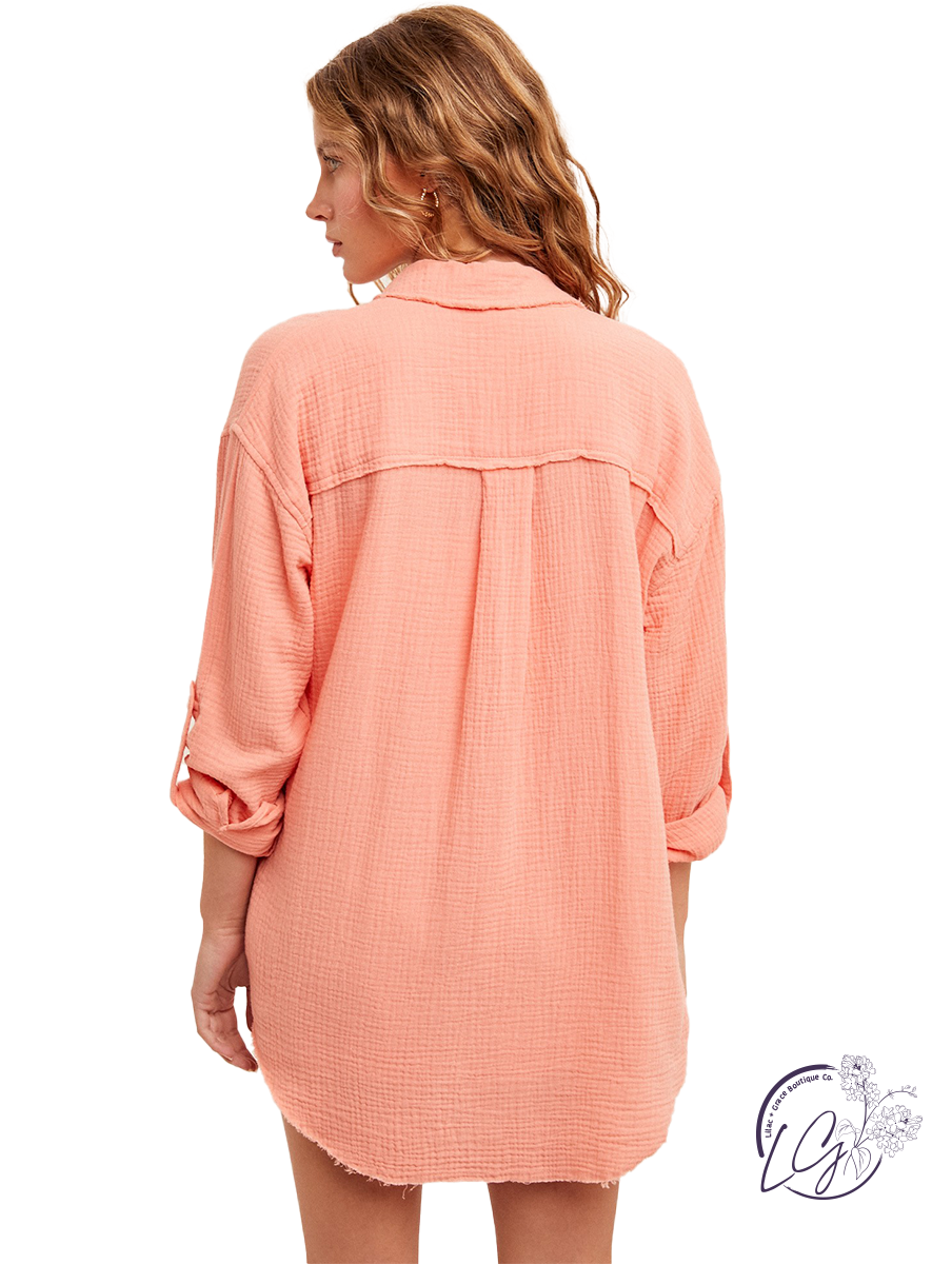 The Artistic Fringe Button-Up is a stylish and versatile garment designed for urban fashion. It features a classic button-up design with two front pockets, adding a touch of utility and functionality. The fringe hem detail along the bottom adds a trendy and playful element to the shirt, making it stand out in any urban setting. With its comfortable fit and eye-catching details, this shirt is perfect for casual outings, city adventures, or adding a pop of personality to your everyday look.