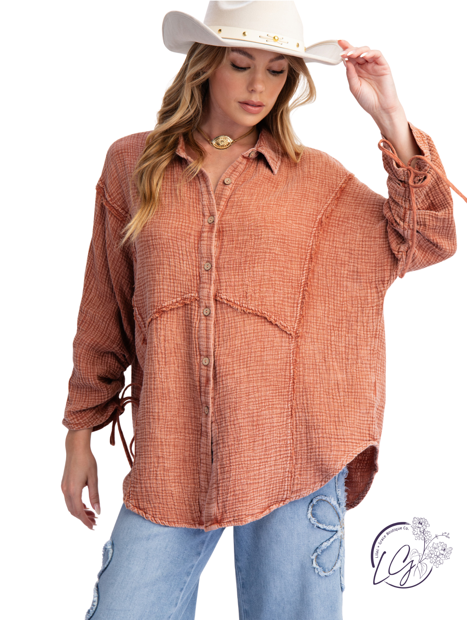 Western charm meets everyday ease in this textured button-down top. Featuring raw edge details, tie accents on the sleeves, and a lived-in crinkle finish, this oversized piece is made for effortless styling. Wear it open over a tank or buttoned up with denim and boots for a rugged yet feminine vibe.