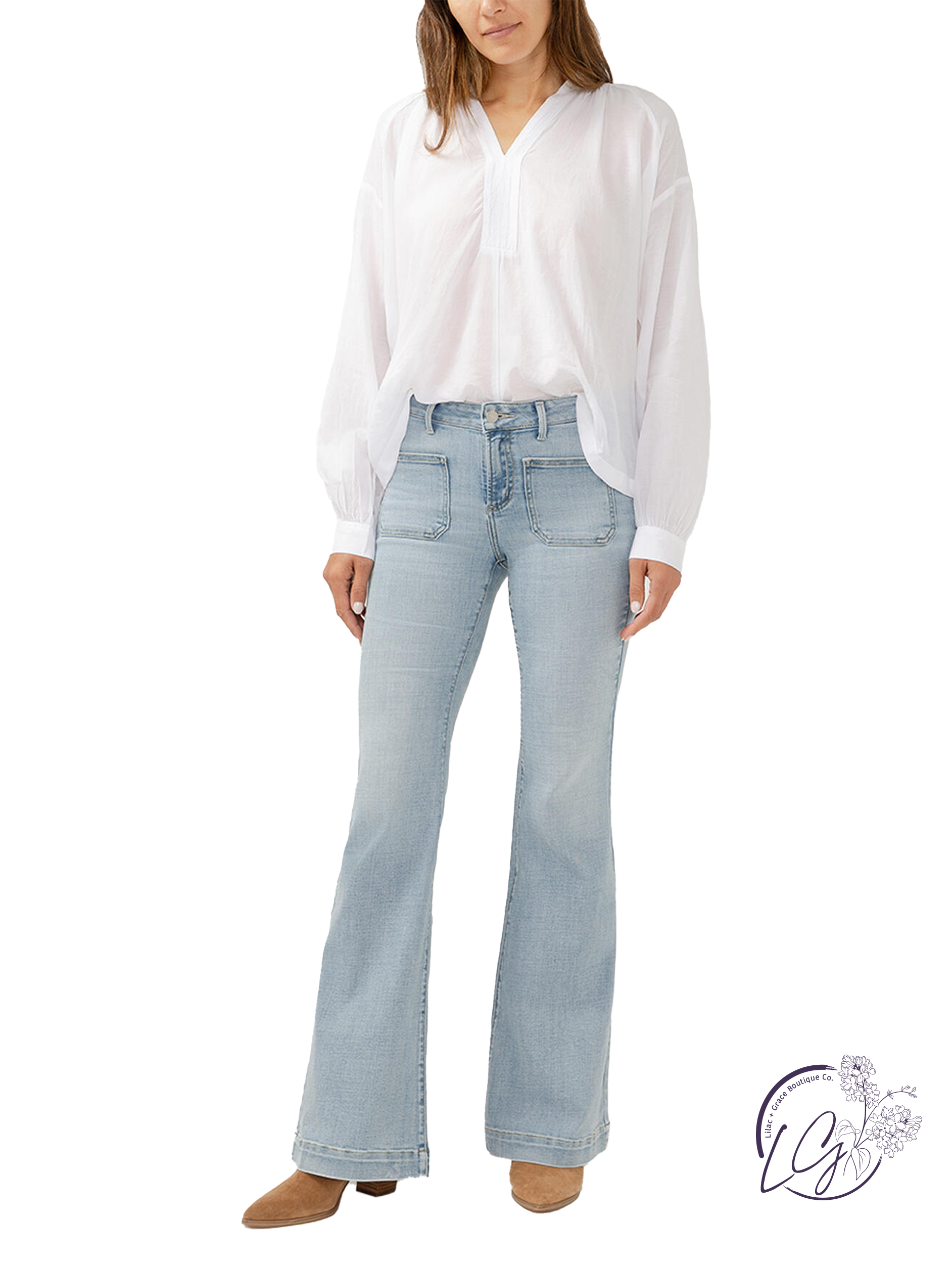 Crafted from Power Stretch denim, they offer exceptional flexibility, softness, and shape retention. The light indigo wash adds a vintage touch, while the 24" flare leg creates a balanced, elongating silhouette. Finished with classic 4-pocket styling, a zip fly, and button closure.