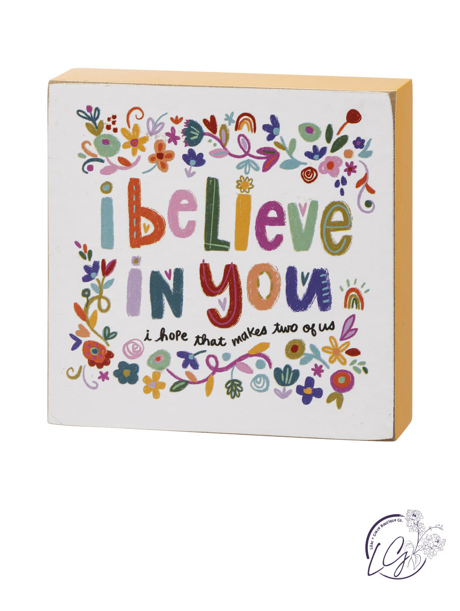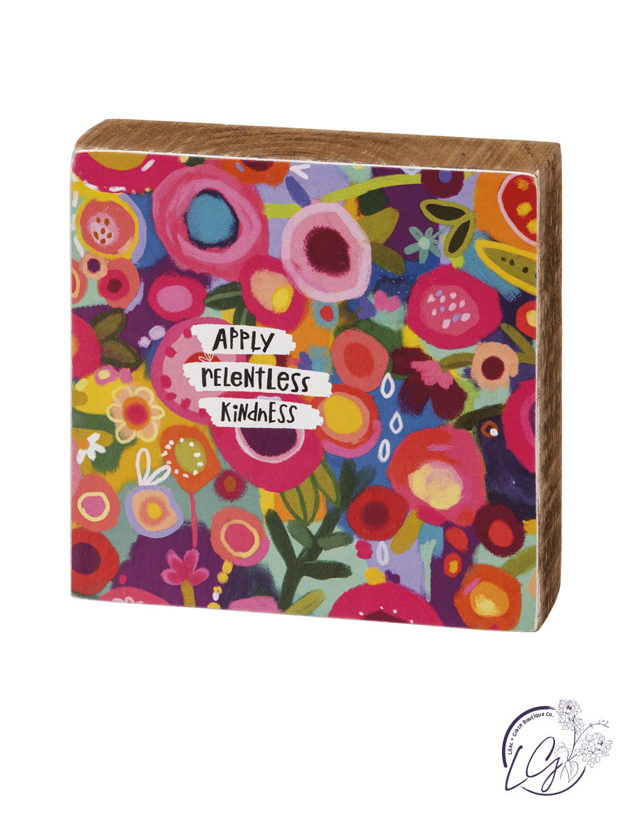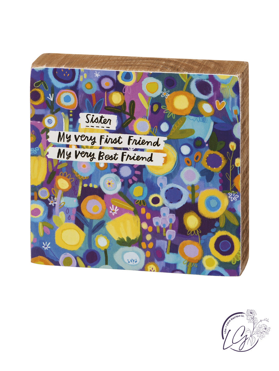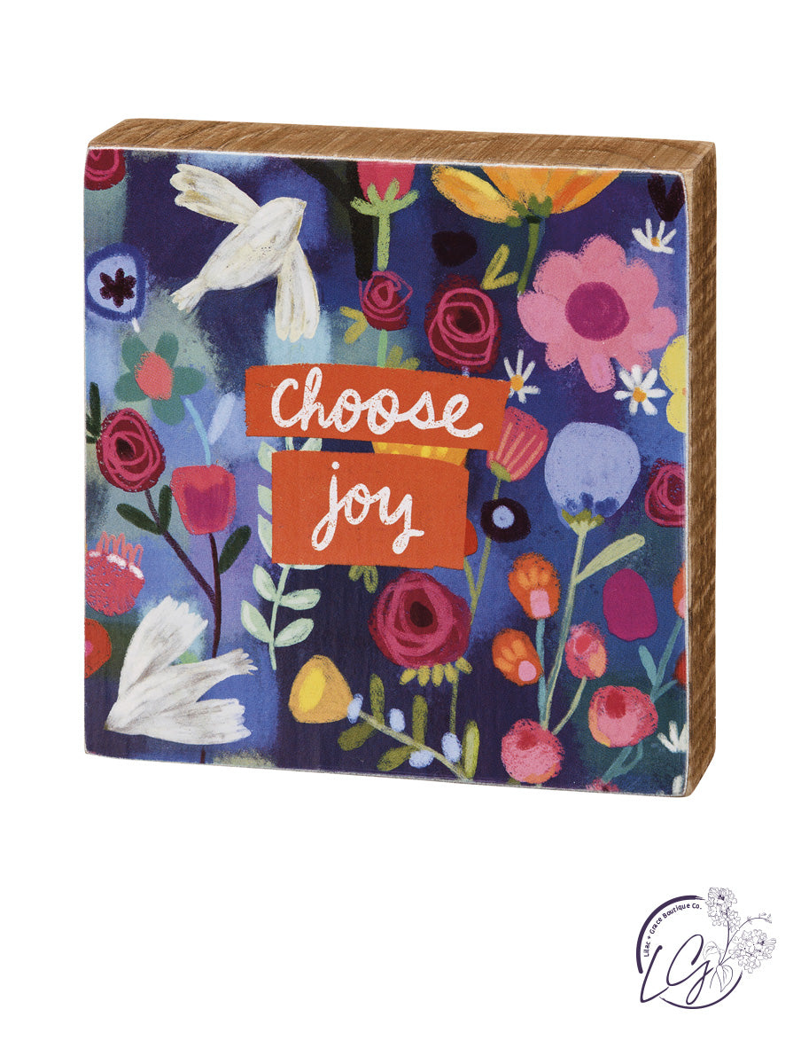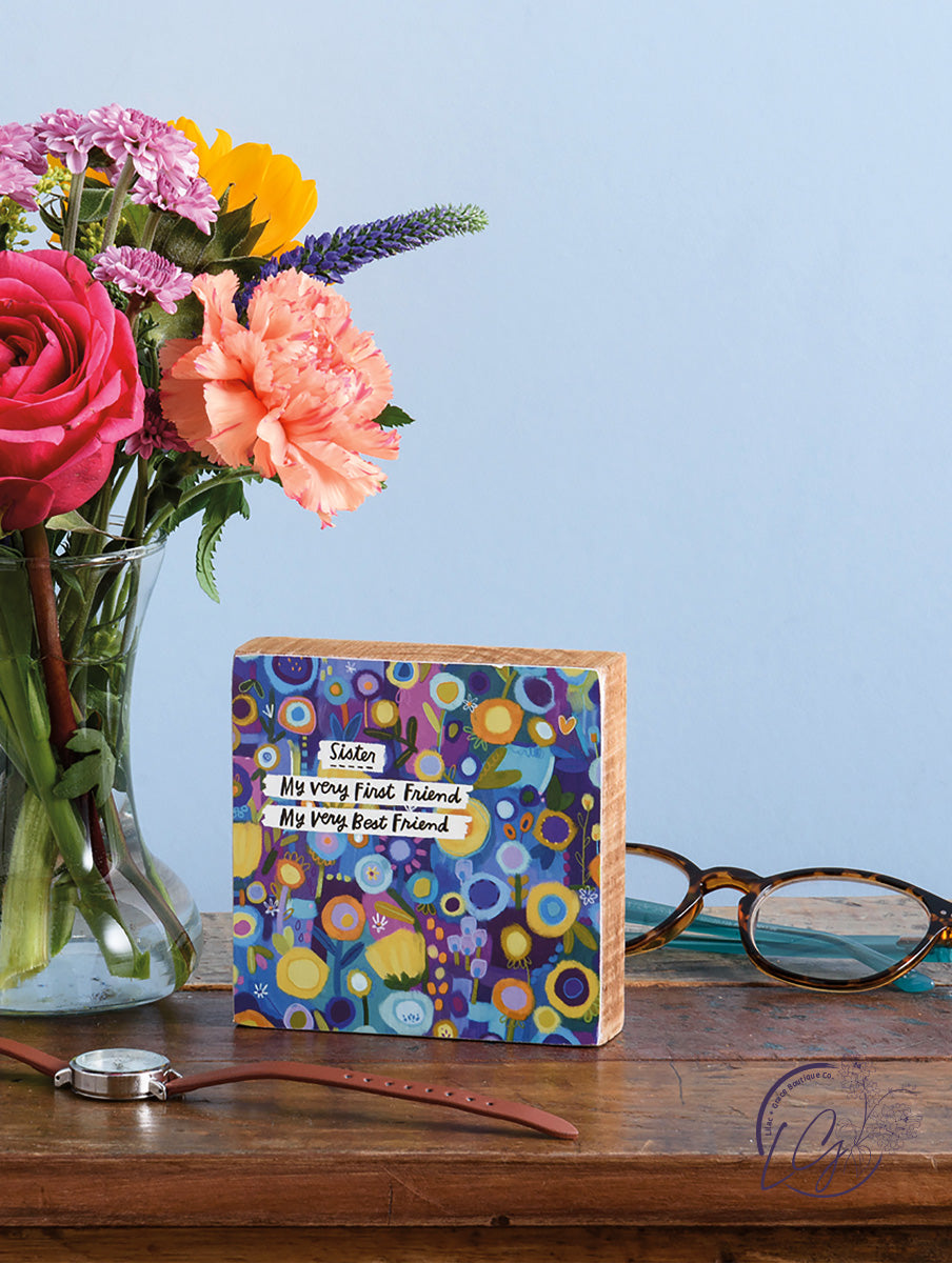 A wooden block sign featuring a vibrant color palette with whimsical floral designs and inspirational words. Wooden wall art is easy to hang via predrilled keyhole slot or can free-stand alone.