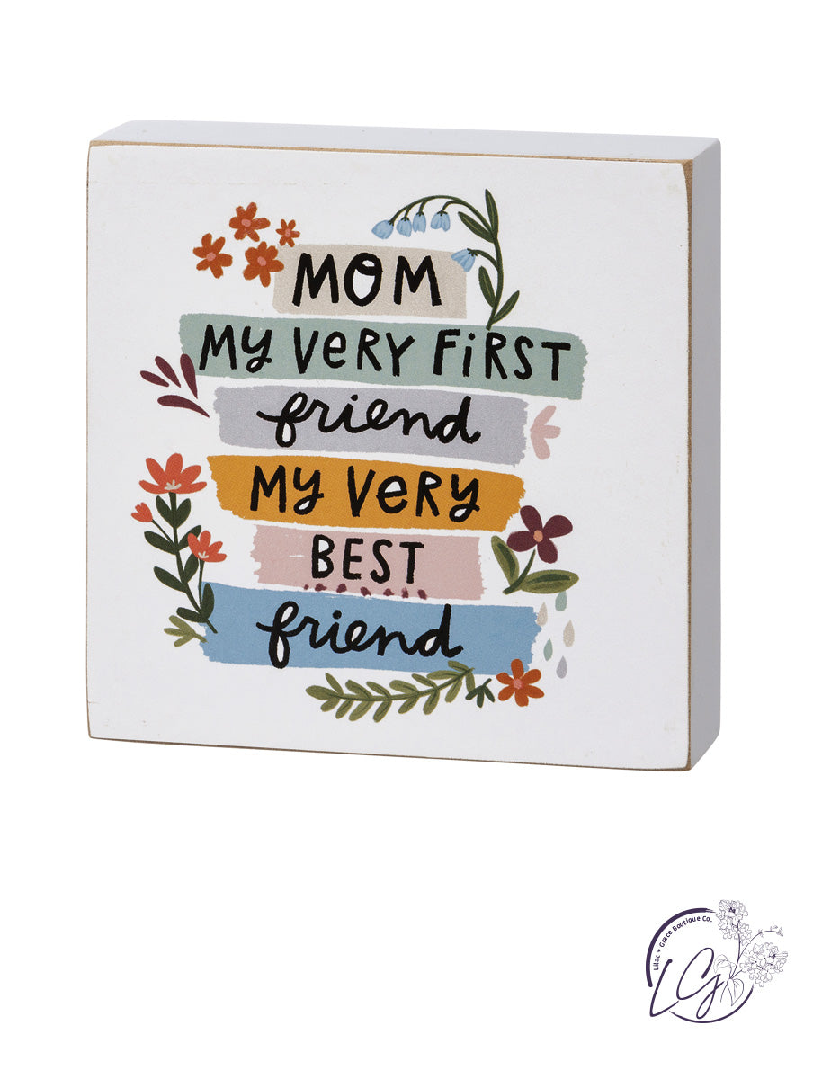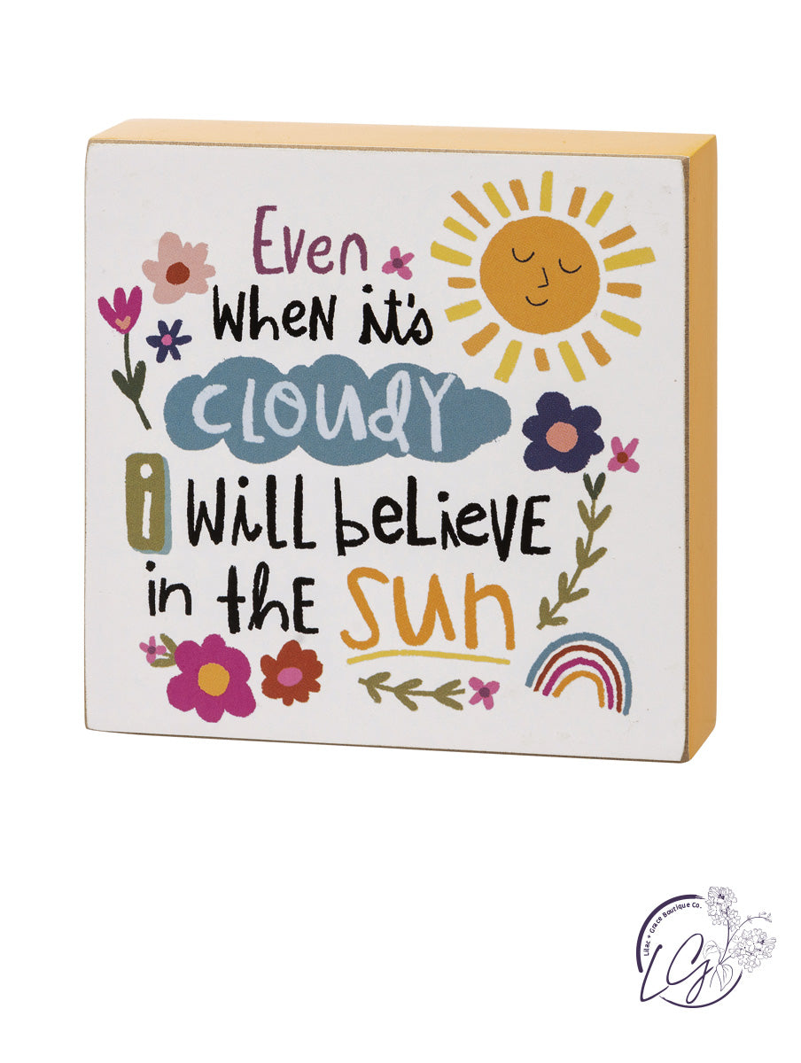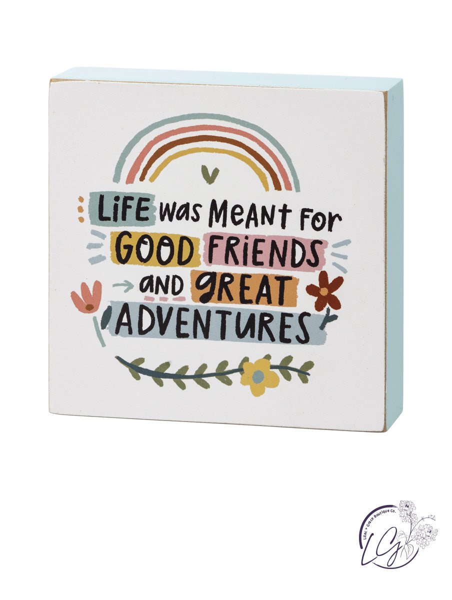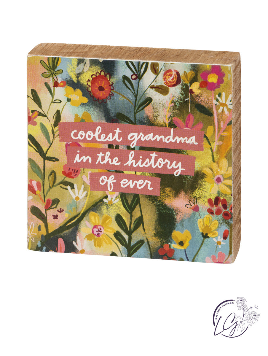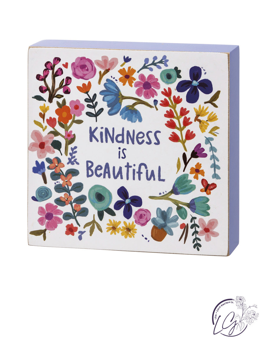 A wooden block sign featuring a vibrant color palette with whimsical floral designs and inspirational words. Wooden wall art is easy to hang via predrilled keyhole slot or can free-stand alone.