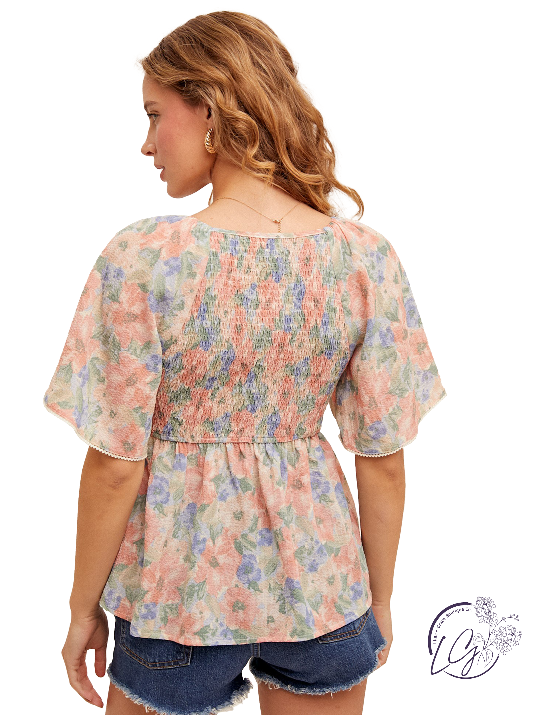 Add a touch of bohemian flair to your wardrobe with our Boho Blossom Flutter Sleeve Peplum Top! This top features flutter sleeves, a smocked floral print, and a feminine peplum design. Perfect for pairing with your favorite jeans or skirt, it's versatile and stylish. Elevate your look with this must-have top!