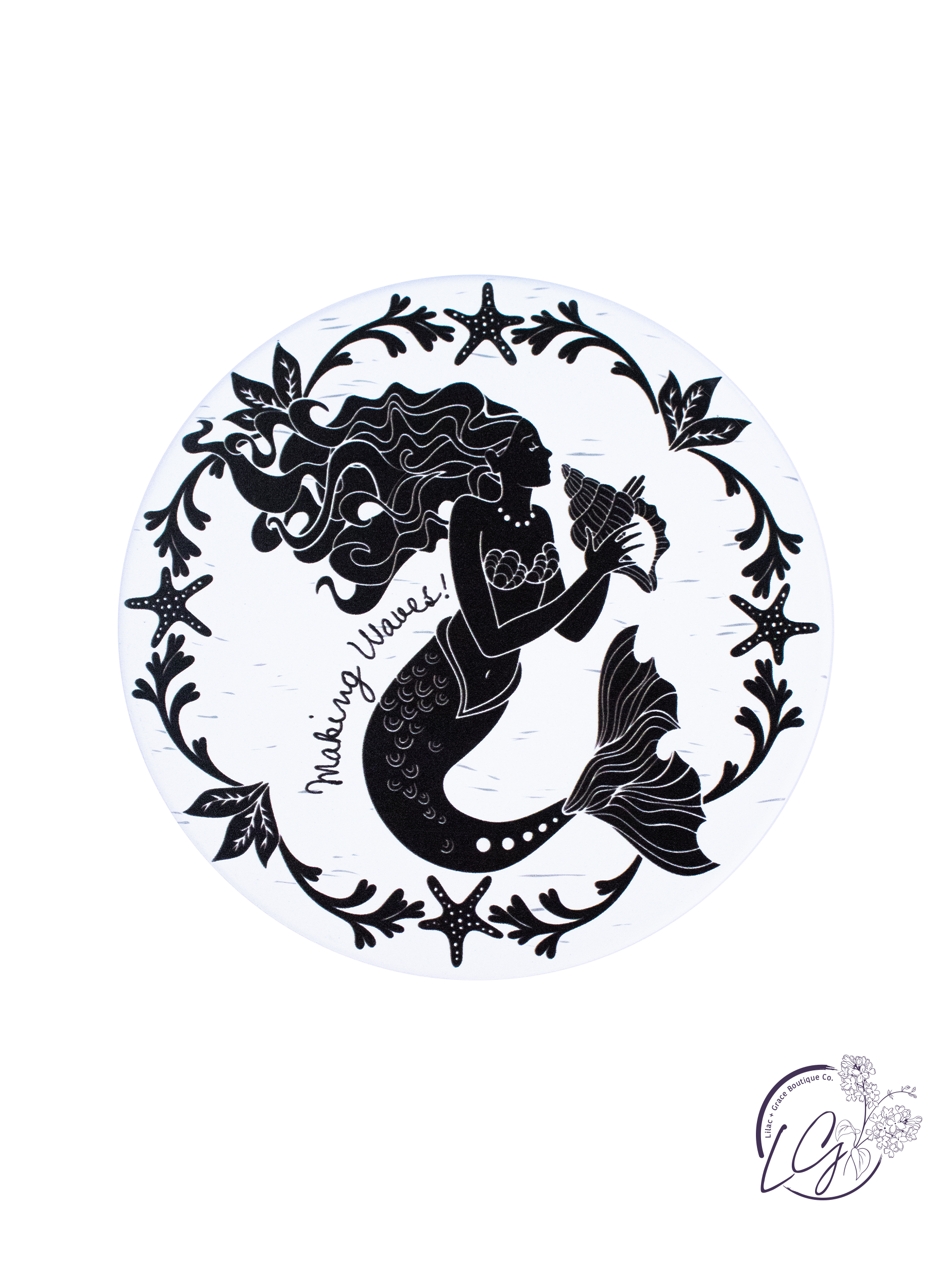 Coaster size approx. 4"D x 0.24"H. Holder size: Approx. 4.5"L x 4.5"W x 2.25"H