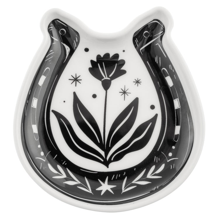 This boho-inspired black and white shaped trinket tray features a unique horseshoe design, adding a touch of charm to any space. Perfect for holding jewelry, keys, coins, or any other small items, this tray is both functional and stylish. Made from high-quality materials, this tray is durable and easy to clean. Whether used as a decorative piece on a dresser or as a practical organizer on a desk, this horseshoe trinket tray is sure to add a touch of whimsy to your home decor.