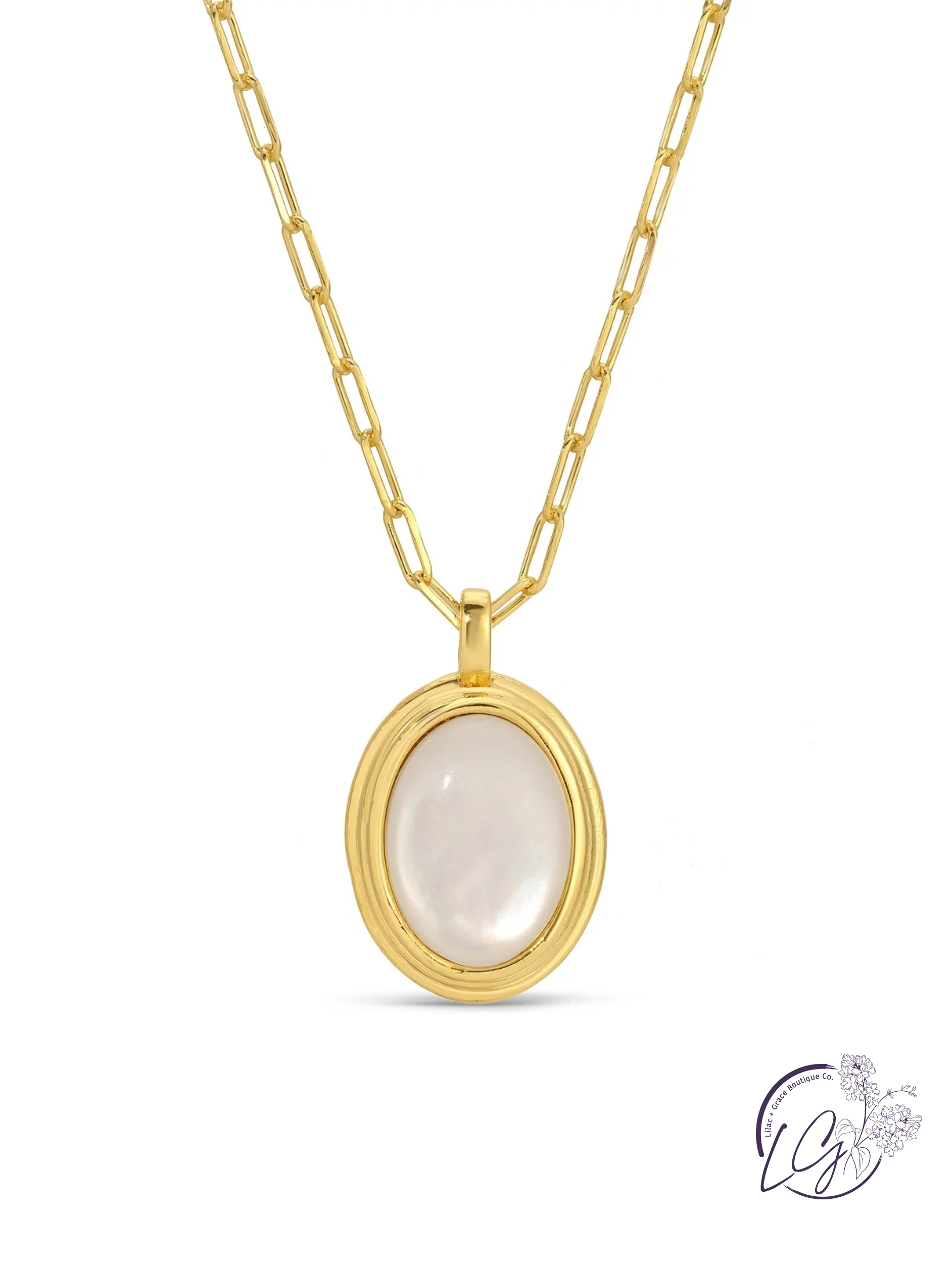 A statement piece, featuring an oval pendant adorned with mother of pearl and protected by a thin layer of resin on a delicate paperclip chain.