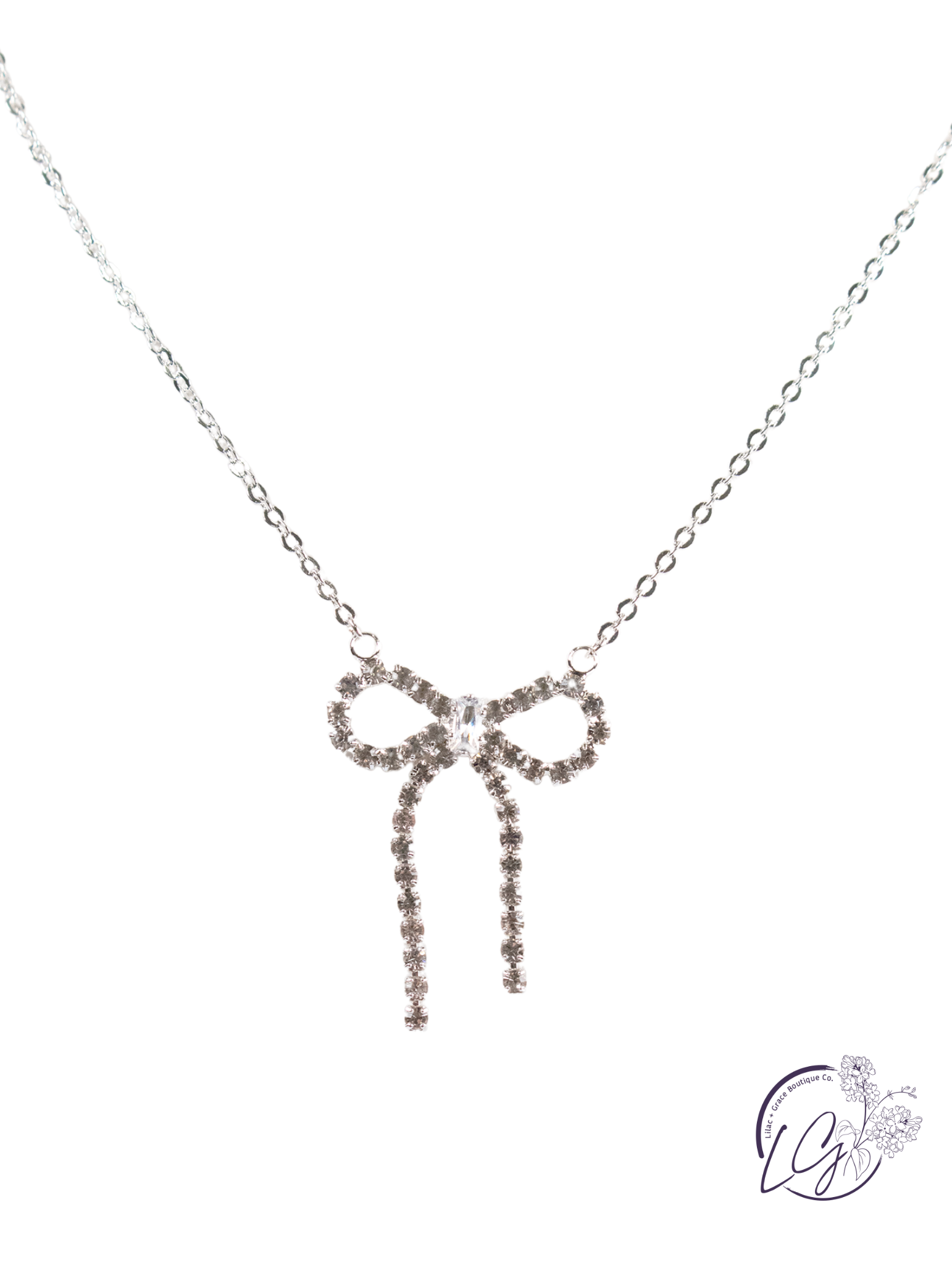 Delicate, timeless, and effortlessly chic, this Bow Pendant Necklace is designed to captivate. Featuring a gracefully sculpted bow encrusted with shimmering stones, this exquisite piece embodies sophistication. At the heart of the design, a luminous central gemstone catches the light, adding a mesmerizing focal point. Suspended from a fine, elegant chain, this necklace is the perfect accessory to elevate any ensemble.