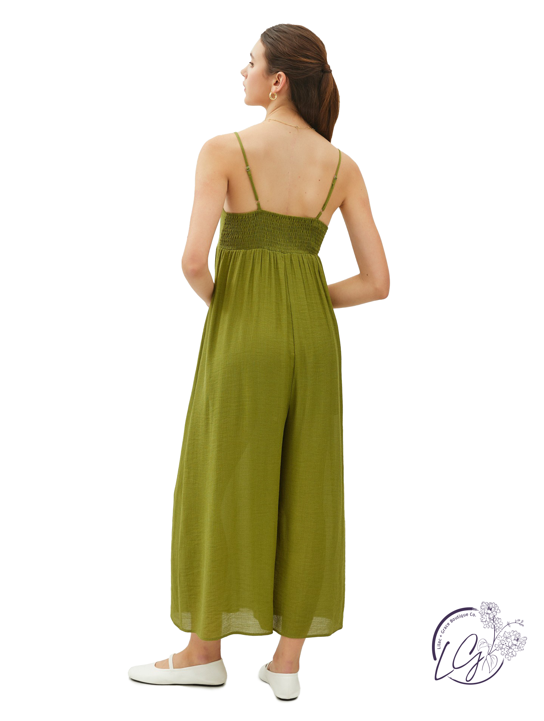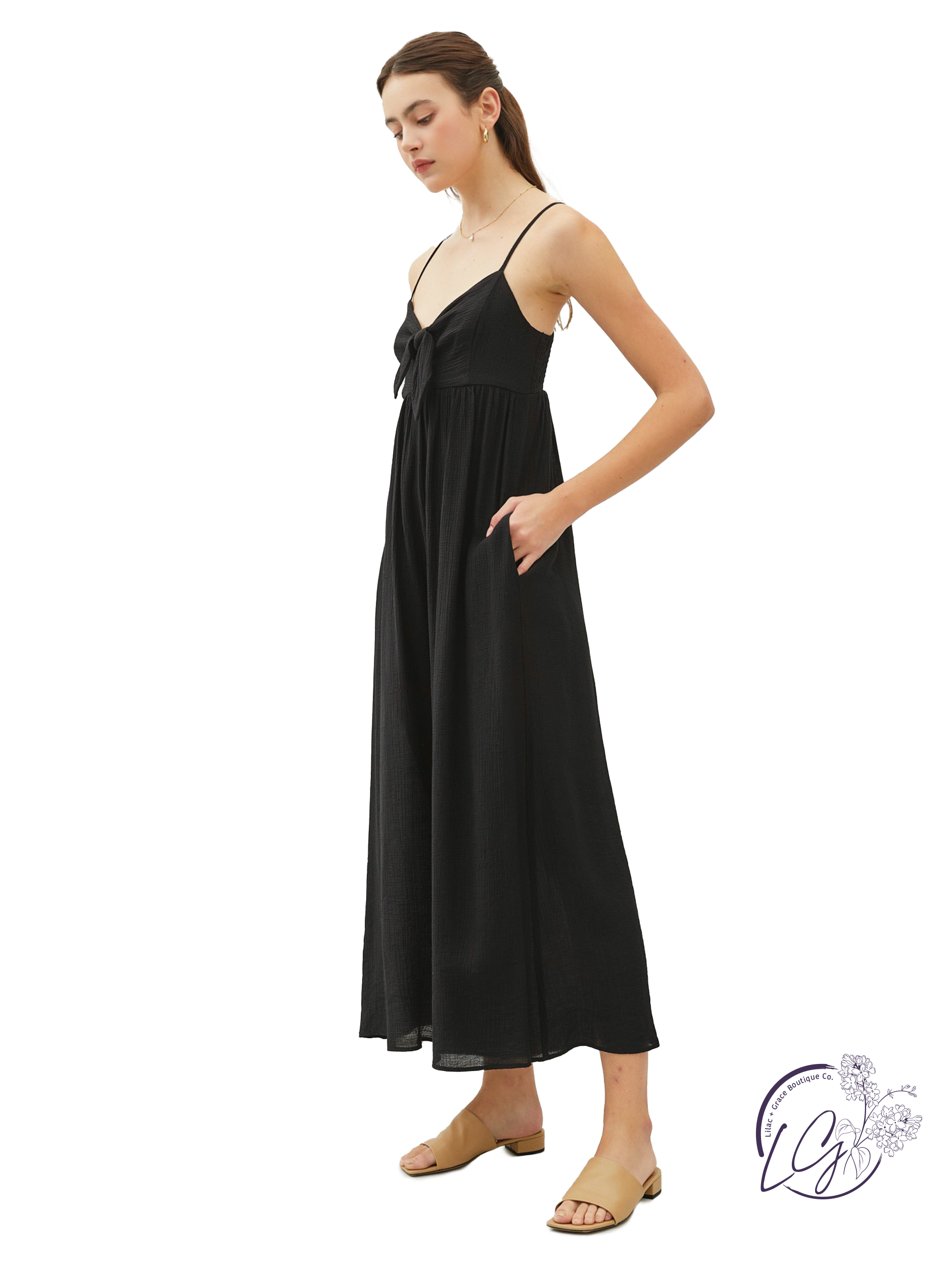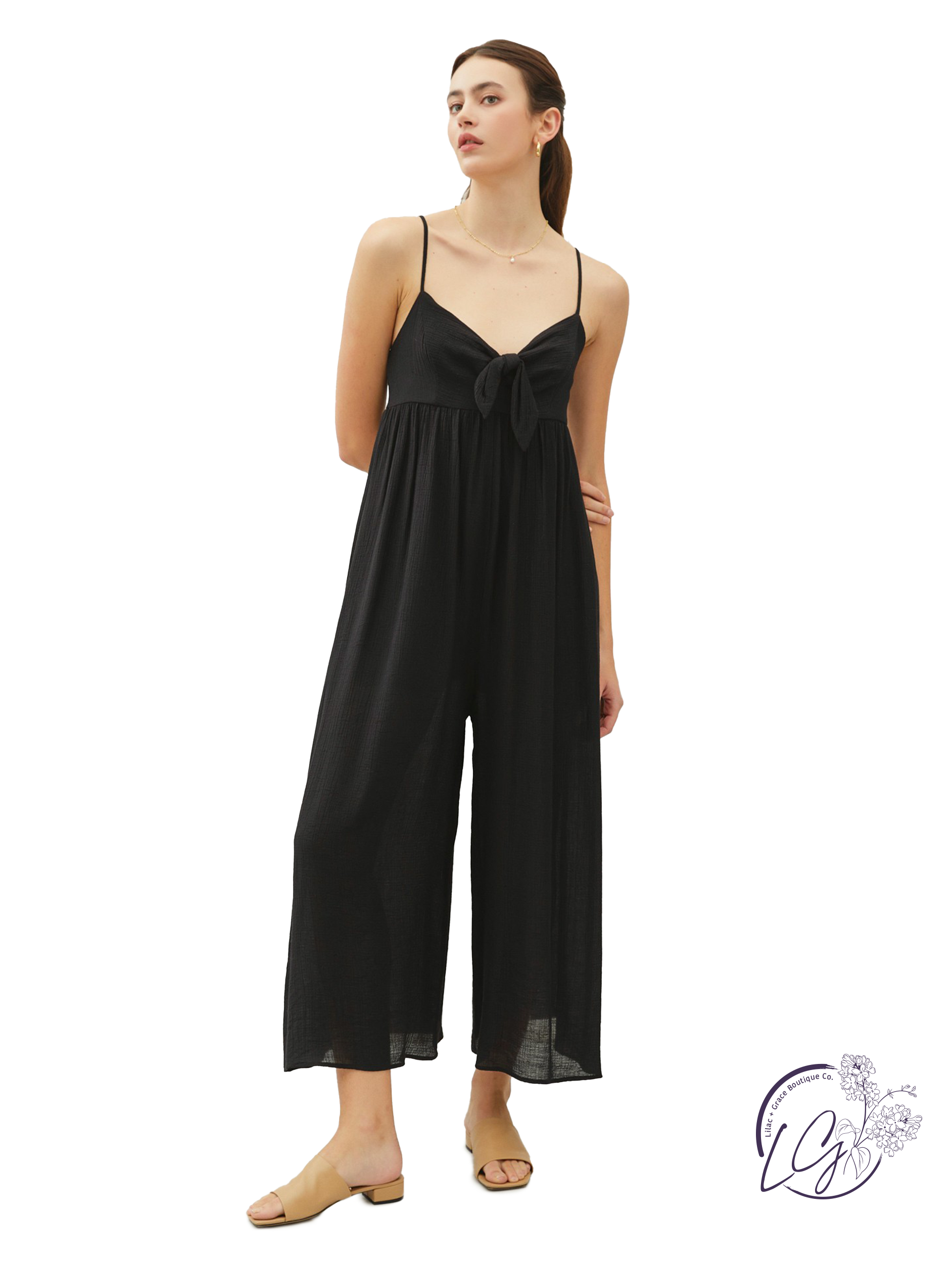 Slip into this flowy, fun-filled jumpsuit with a sweetheart neckline and a playful front tie and bow. Its relaxed fit and adjustable spaghetti straps make it perfect for all your spring and summer adventures. Plus, with a handy side pocket, you can keep your essentials close at hand. Get ready to turn heads in this cute and quirky tank jumpsuit!