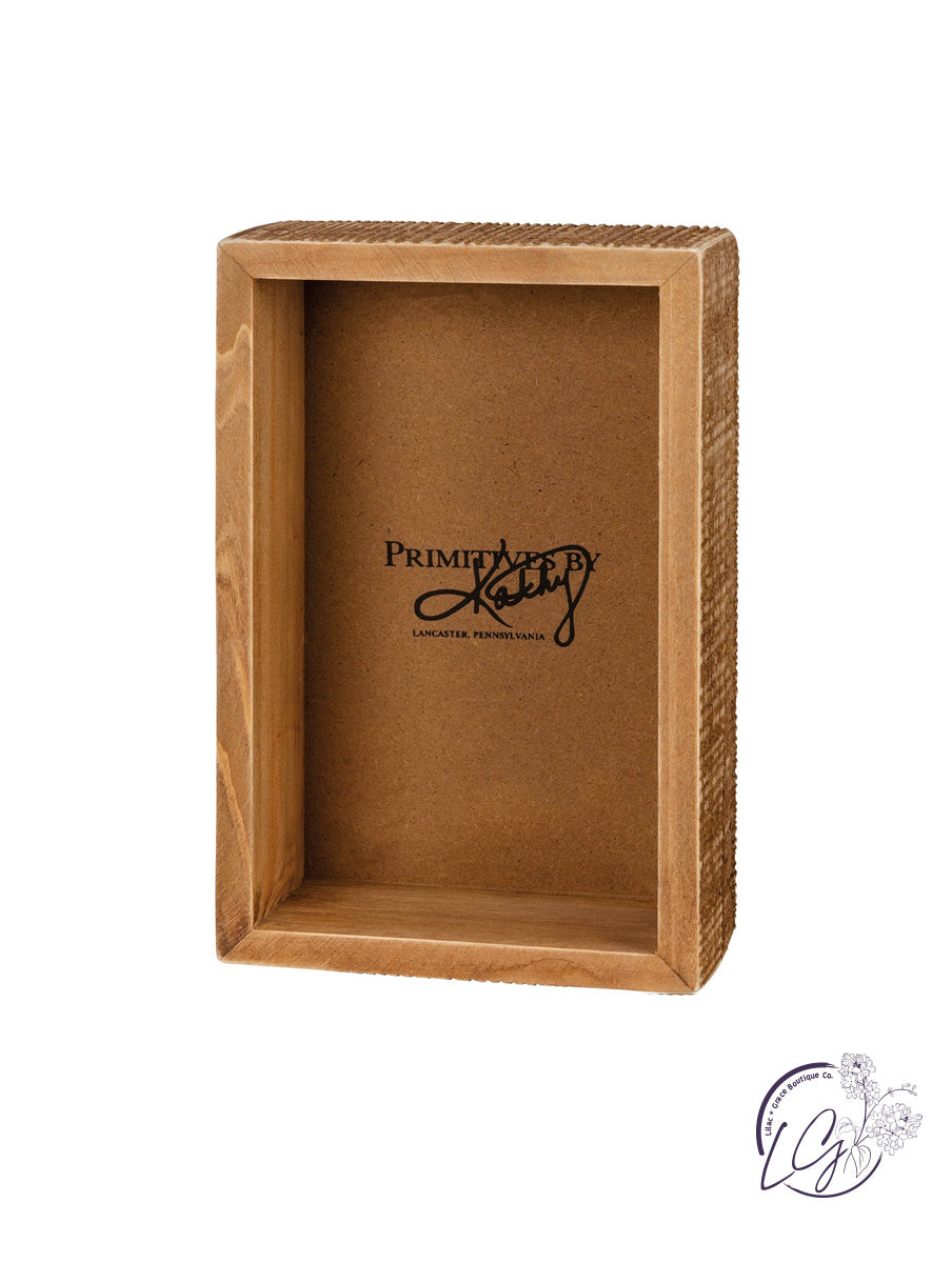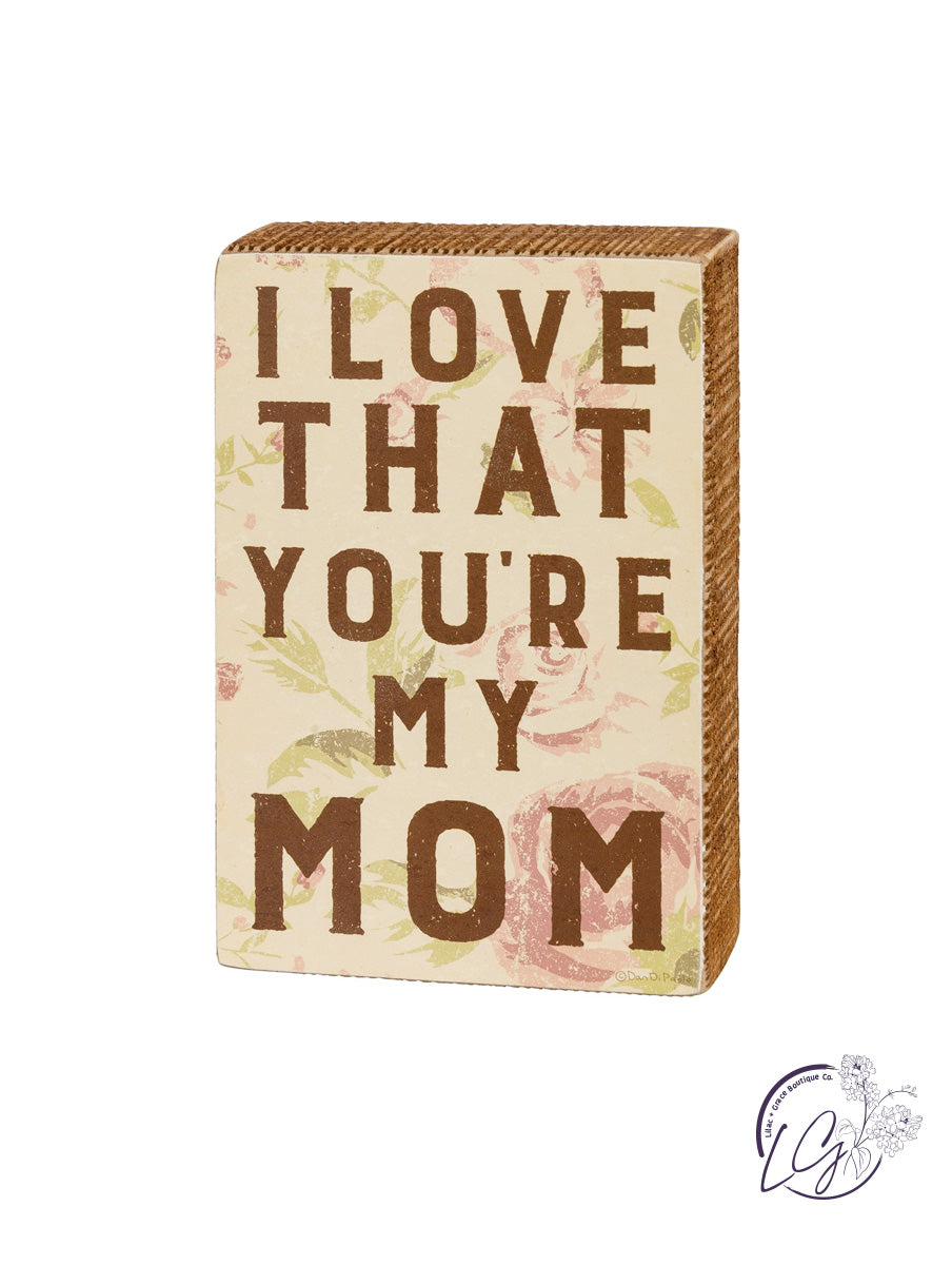 A wooden box sign featuring a rustic floral design and "I Love That You're My Mom" sentiment. Easy to hang or can free-stand alone.