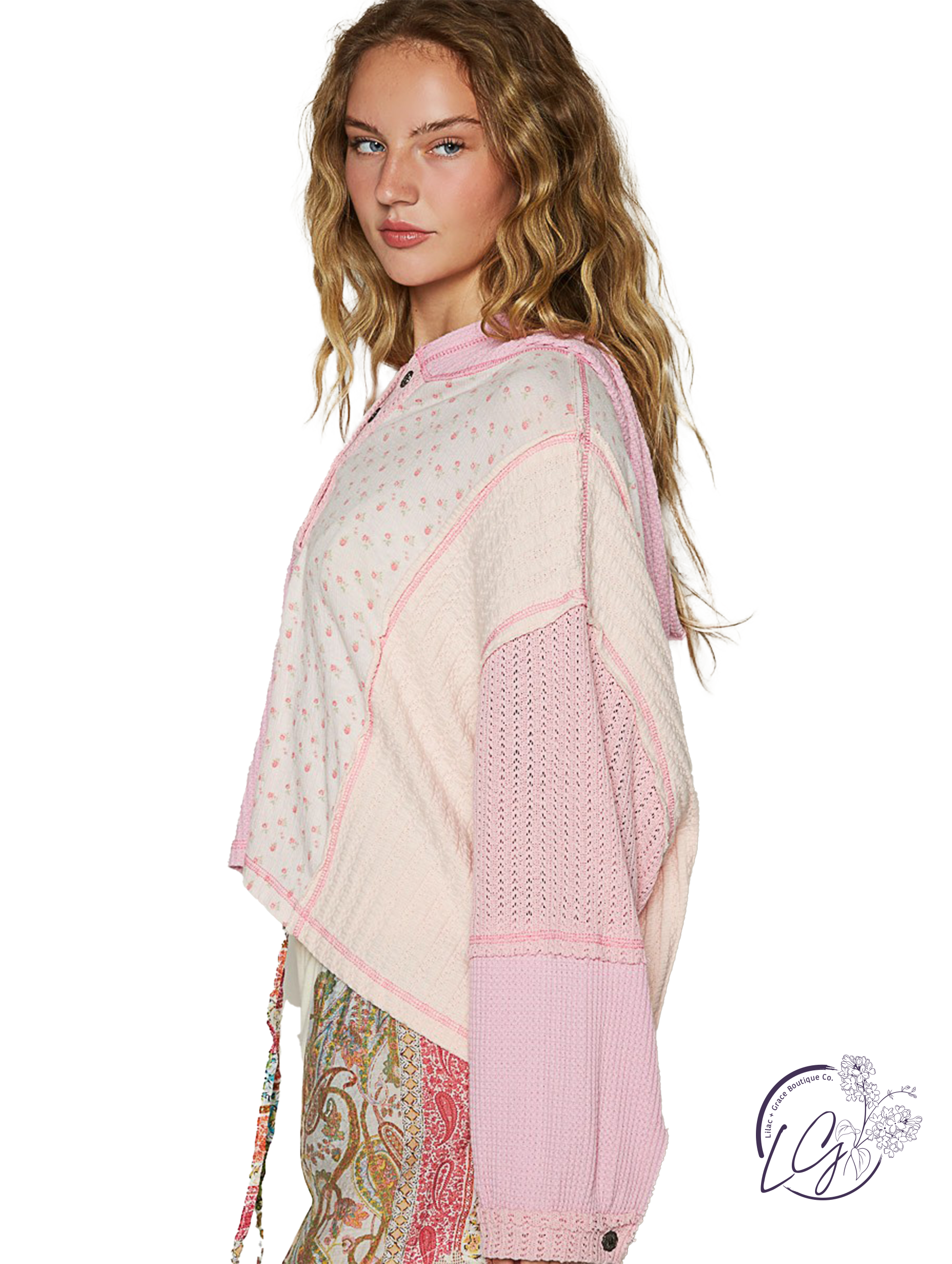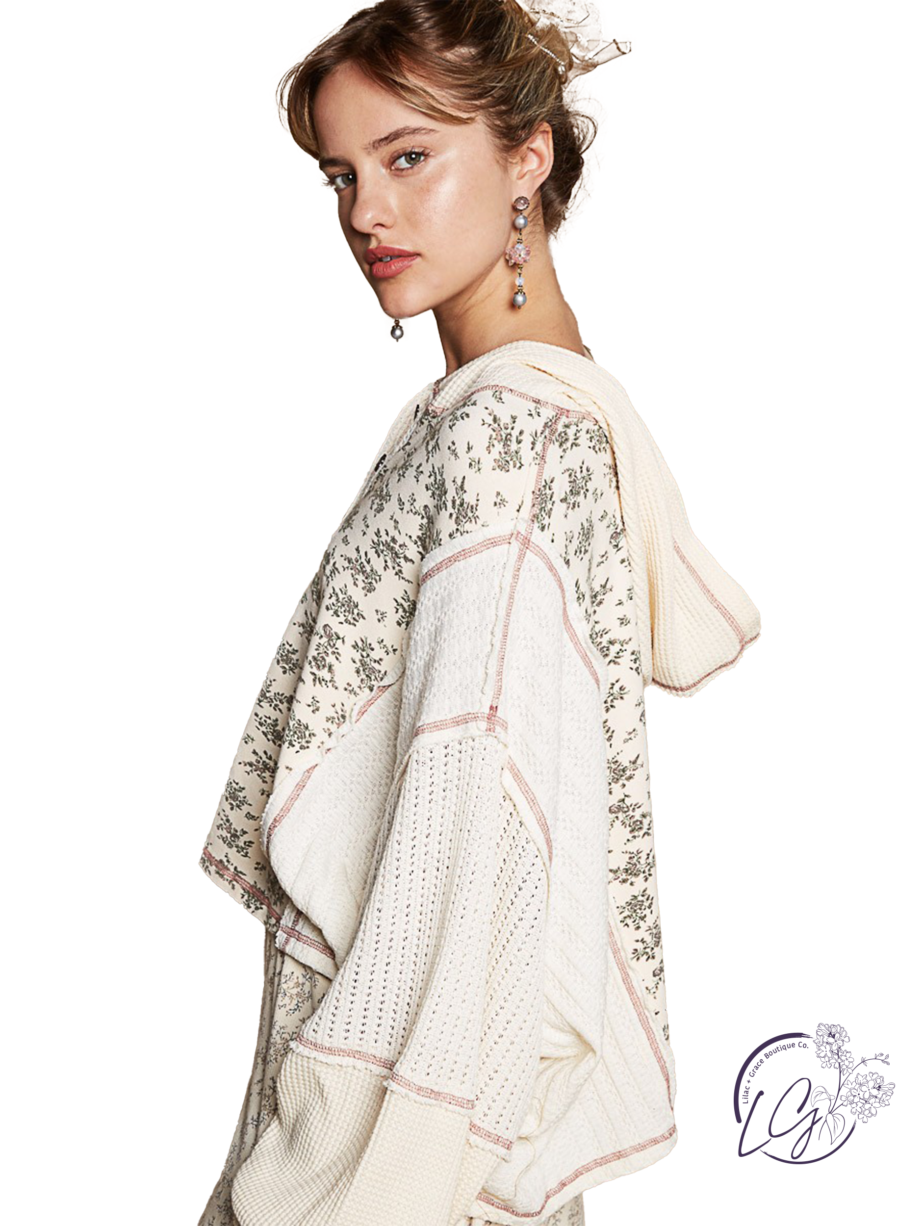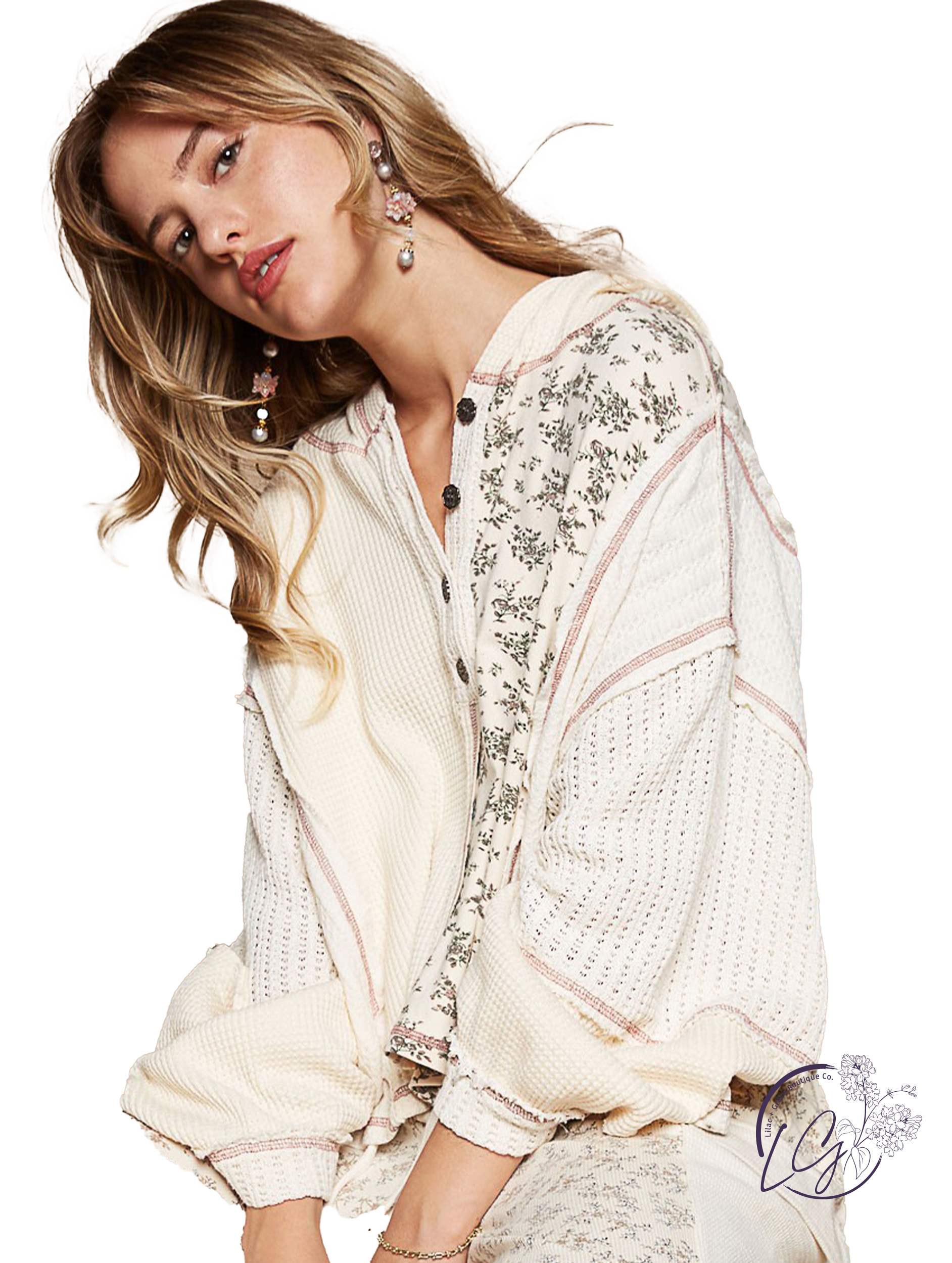 Elevate your style with our By The Fire Knit Top! Featuring a placket hoodie, balloon sleeves, and overlock stitch detailing, this semi-cropped top is designed for both comfort and fashion. Made with a thermal and cut and sew knit mix, it flaunts a unique pointed floral pattern that will surely catch the eye. Add a touch of cozy and chic to your wardrobe today!