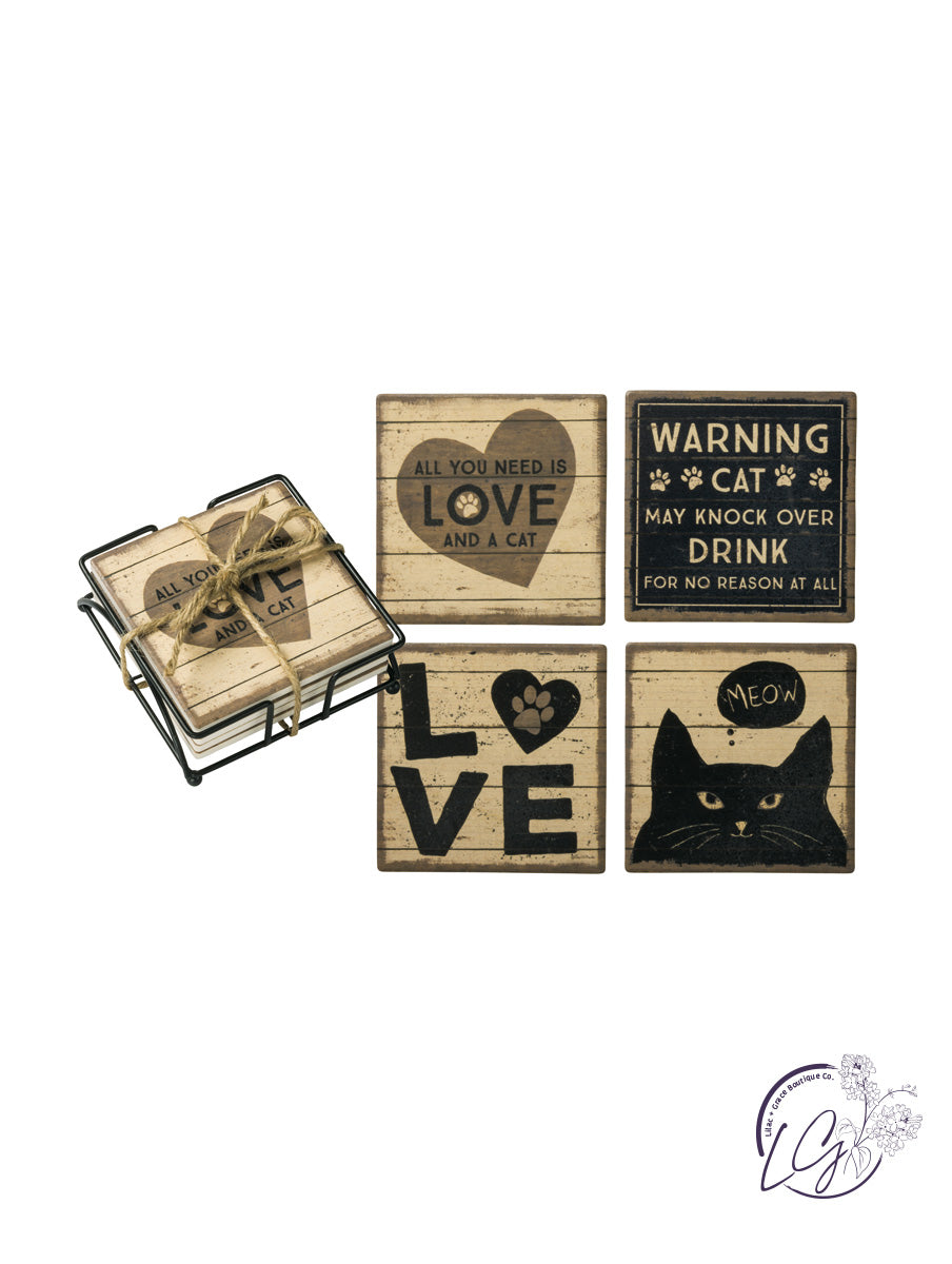 Absorbent stone coasters lending "All You Need Is Love And A Cat," "Warning - Cat May Knock Over Drink For No Reason At All," "Love," and "Meow" sentiments with varying cat, heart, and paw print designs.