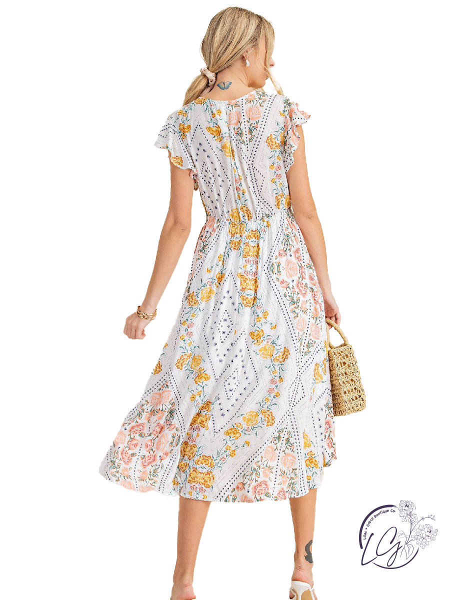 The "Charming Blossoms Dress" is an enchanting and graceful garment that captures the essence of nature's beauty. This dress features a captivating display of blossoms, exuding a sense of charm and elegance. This floral dress can be styled in numerous ways. For an elegant and chic ensemble, you can pair it with heels and some delicate jewelry. To add a touch of bohemian flair, you can wear it with ankle boots and a wide-brimmed hat.