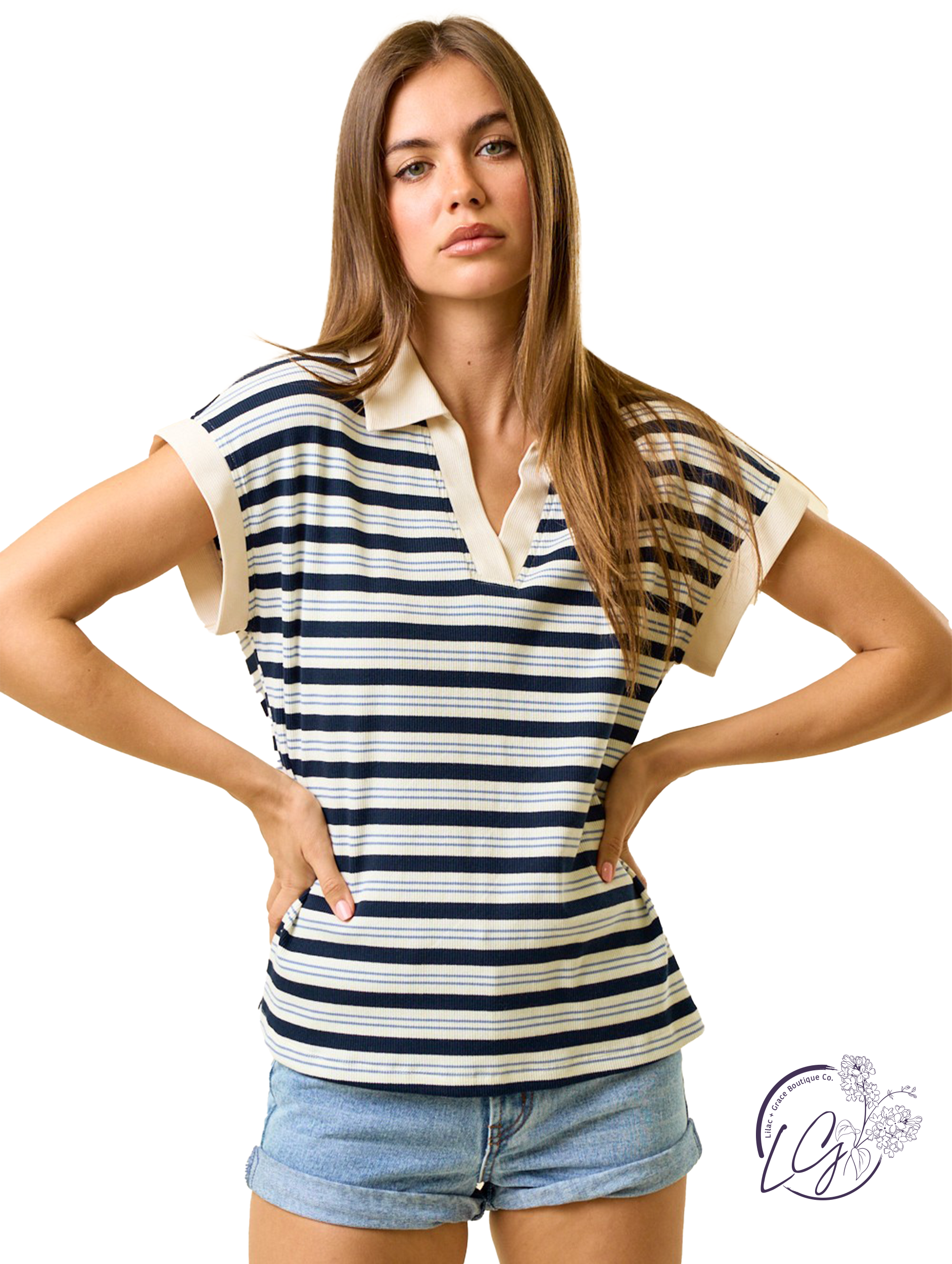 Upgrade your casual collection with this striped ribbed dolman-sleeve top. Featuring a classic polo-inspired V-neck collar, this top blends comfort with a polished feel. The ribbed texture adds depth, while cuffed short sleeves and a relaxed, boxy fit make it effortlessly flattering for all body types. Pair it with denim shorts for a laid-back weekend look or tuck it into trousers for an easy, sophisticated vibe.