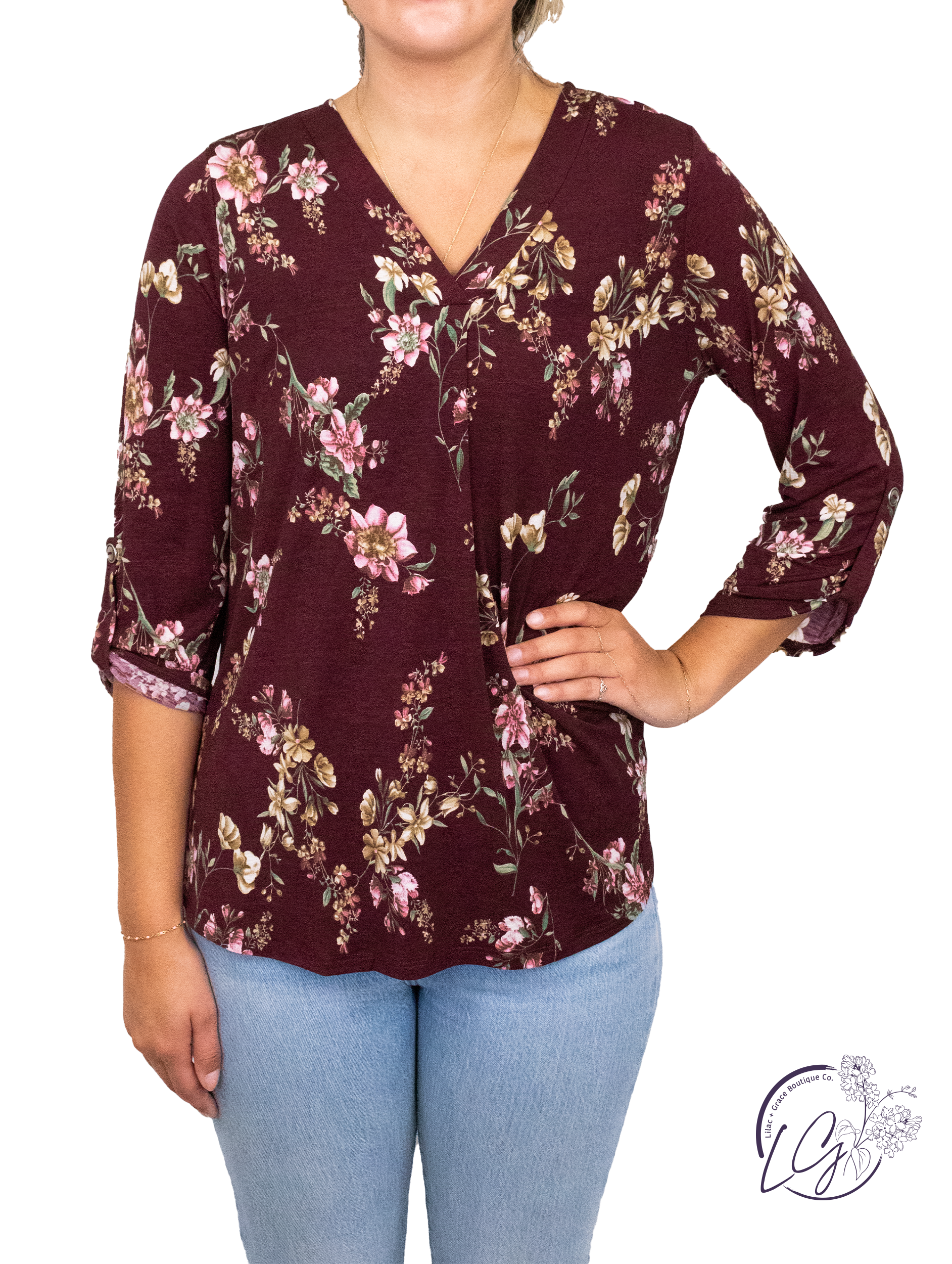 Introducing our Wine Floral Scarlett Classic Top - the perfect combination of style and comfort! Featuring a v neckline band, rolled up sleeves, and a non-sheer, wrinkle-free fabric, this top is both stretchy and roomy for easy wear. Elevate your wardrobe with this must-have piece!