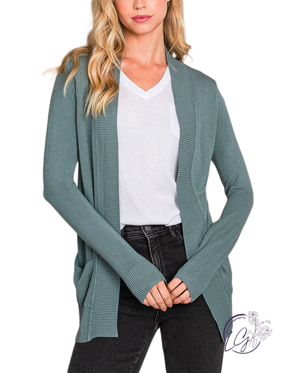 Casual open cardigan featuring cotton blend knitting sweater with front pocket featuring , ribbed cuffs and hem. The soft knit cardigan is prefect for a breezy layering.