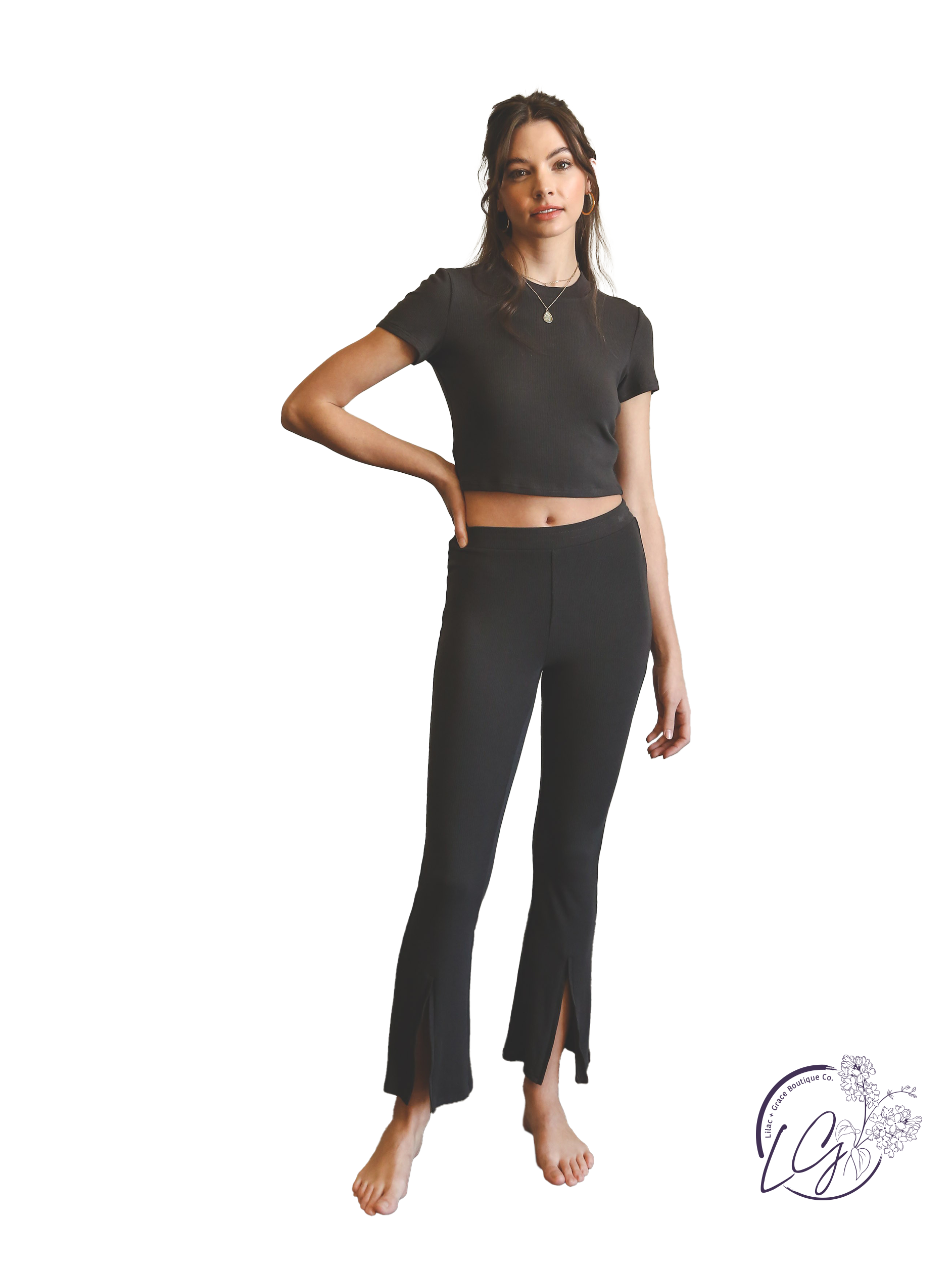 Turn heads and make a statement with these risk-taking, ribbed flared pants! Designed with a sleek, clean hem and a slightly flared, dynamic shape, these pants feature an elastic waistband and a bold slit down the center front. Embrace the adventure and show off your unique style with these Classy & Comfy Ribbed Flared Pants. To achieve the perfect fit, follow the lead of our model who is 5' 10" and wearing a size Small with measurements of 32-26-35.
