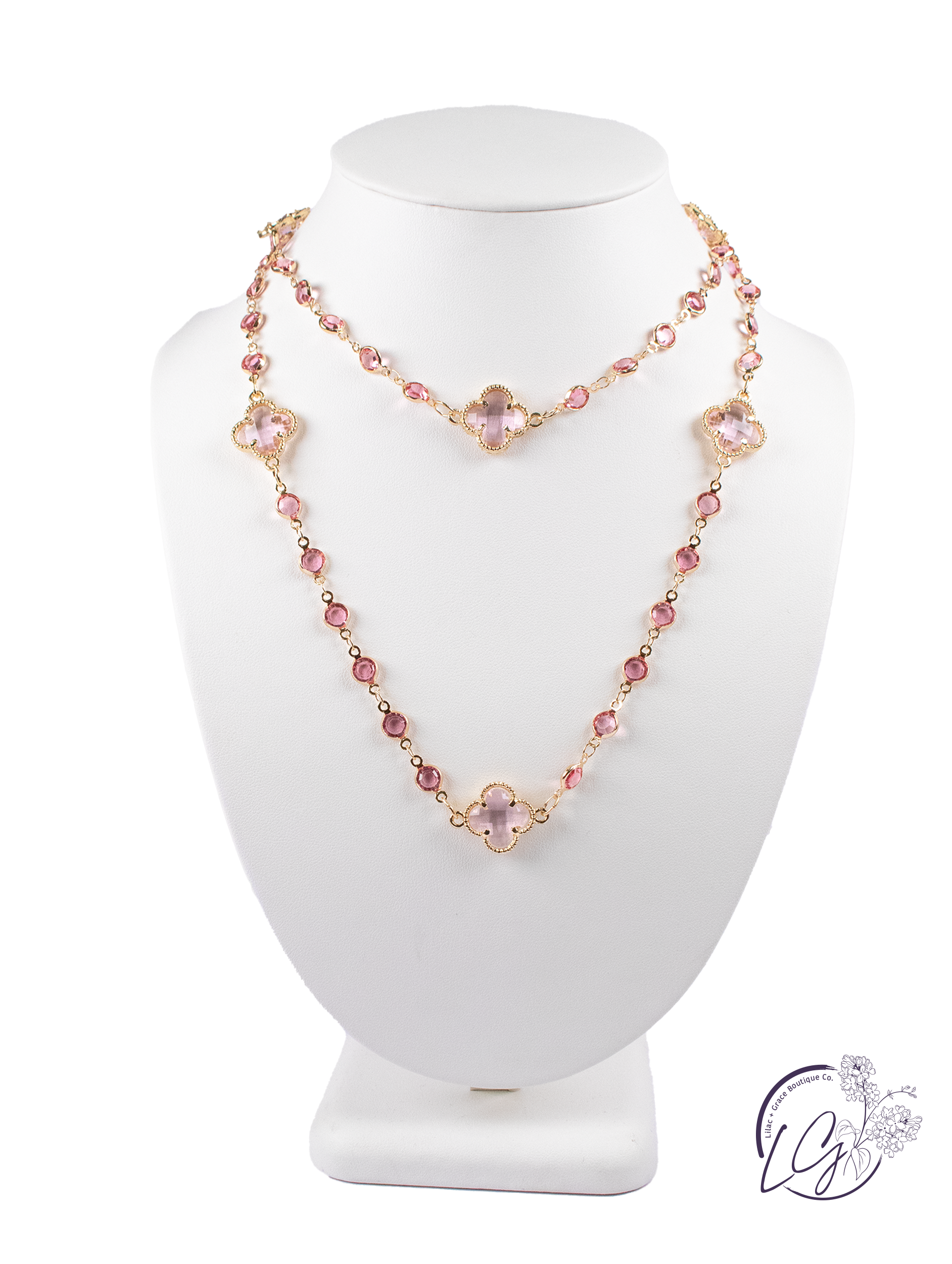 Embrace elegant charm with this captivating long chain necklace. Adorned with a series of delicate, faceted round beads interspersed along the chain, this piece also features three enchanting clover-shaped stations. Each clover boasts a lustrous, smooth stone, adding a touch of sophisticated allure. Perfect for layering or wearing as a standalone statement, this versatile necklace drapes beautifully, enhancing any neckline with its graceful design and subtle shimmer.