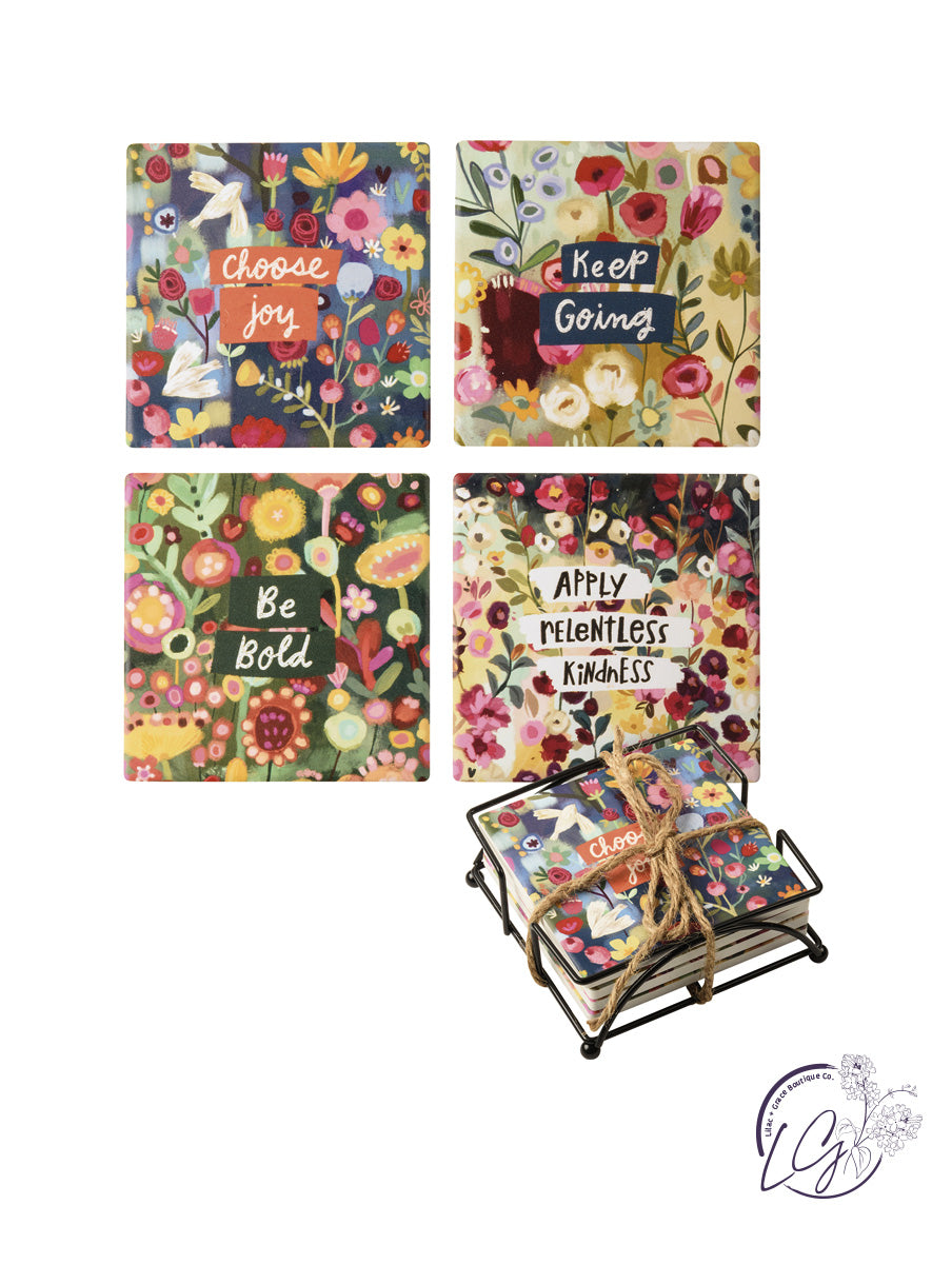 A set of four stoneware coasters with cork bases. Coasters feature vibrant floral designs with "Choose Joy," "Keep Going," "Be Bold," and "Apply Relentless Kindness" sentiments. Wire holder included.