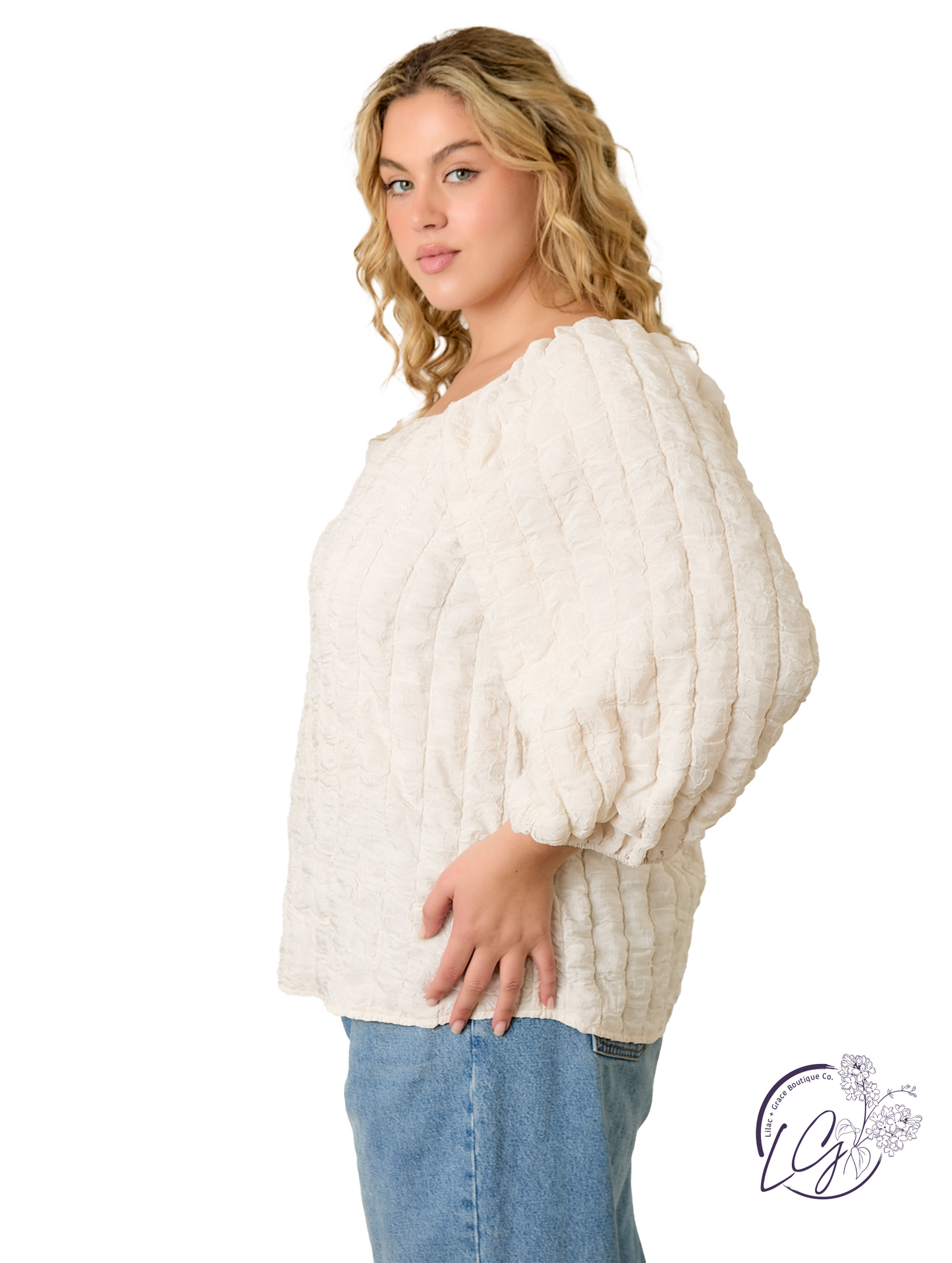 Add subtle dimension to your look with this 3D textured blouse, designed with a clean square neckline and elegant long sleeves. The textured fabric brings visual interest and a soft structure, while the tailored fit offers a polished silhouette. Perfect for both work and weekend plans, it pairs effortlessly with high-rise trousers or denim for a refined finish.