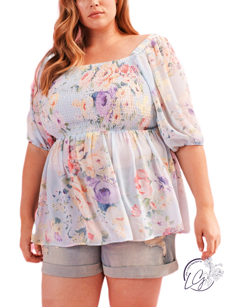 Chiffon floral print blouse featuring square neckline, elbow puff sleeves, and smocked bodice.