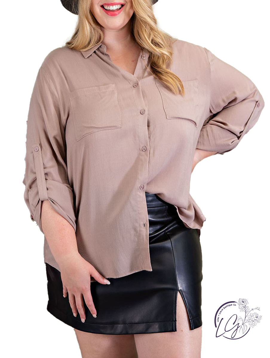 Curvy button down top with long roll tab sleeves, pointed collar, and front pockets.
