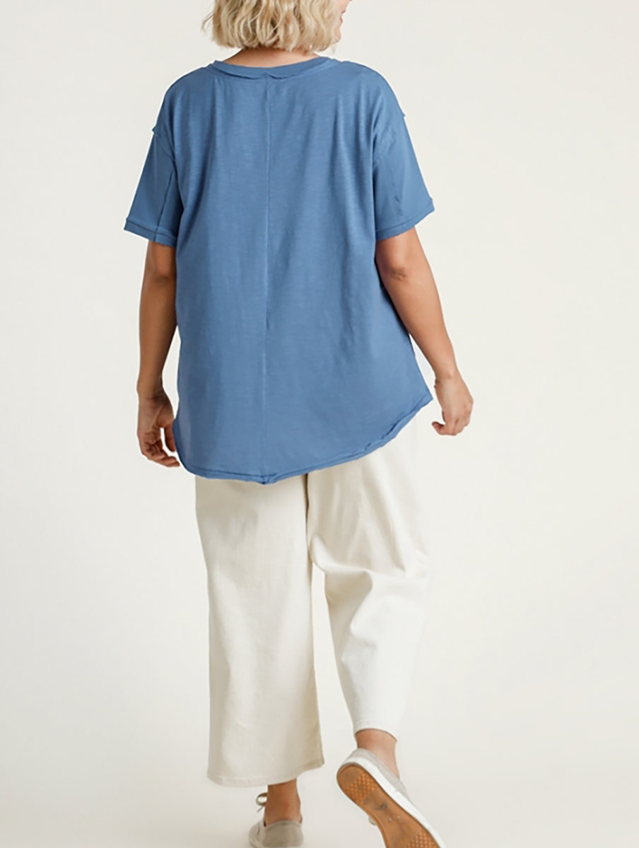 Looking for your new favorite tee? Look no further than the Curvy "Don't Look Back" Basic Tee. This V-neck top features a raw edged hem, high low hemline, and side slits. Perfect for those who appreciate quirky fashion and comfort. (We don't cut corners, just hems!)
