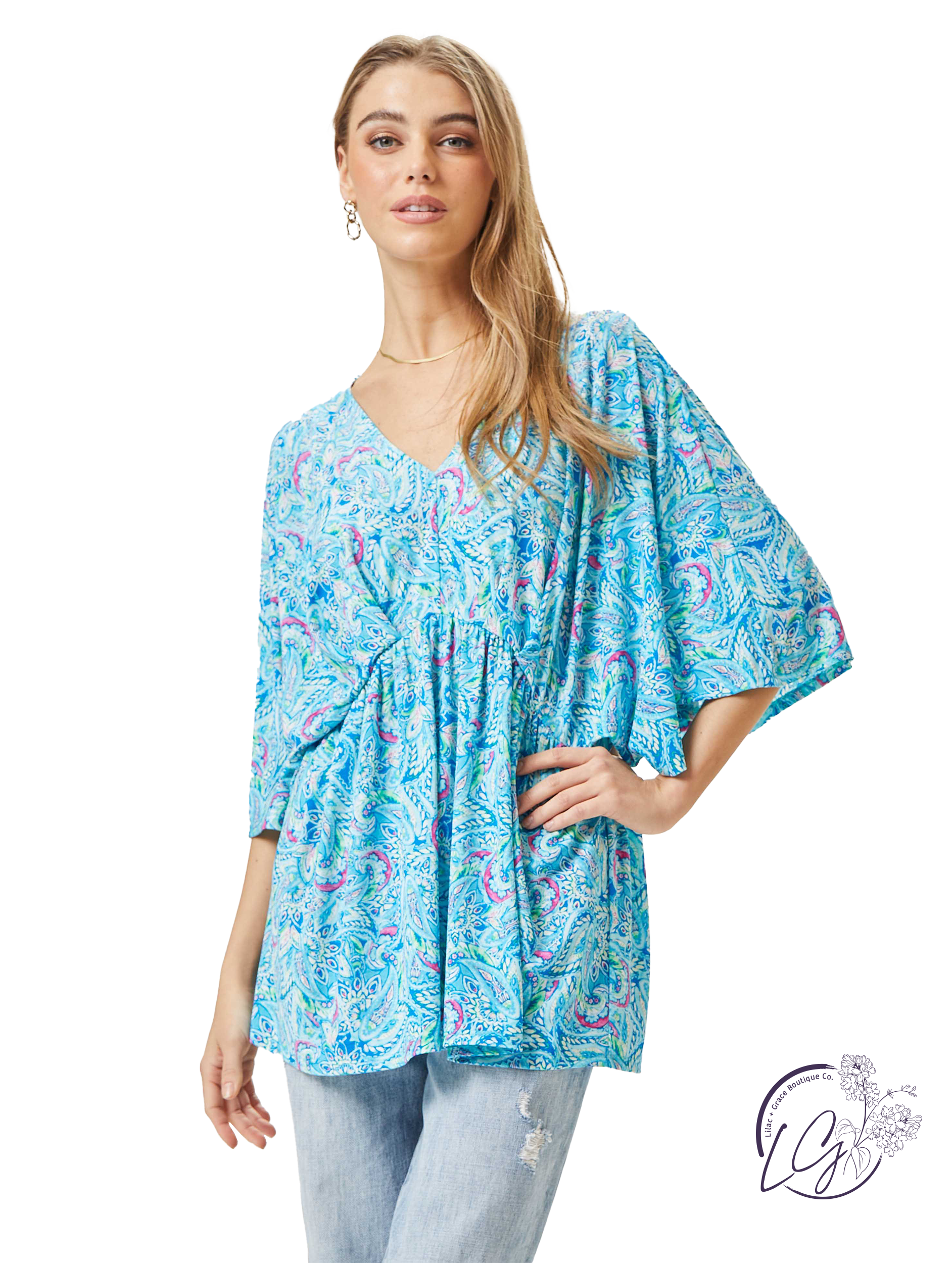 Introducing our newest line: Dear Scarlett! This dreamer top features dolman sleeves with v neckline and pleating details throughout the waist seam. We love the flattering fit on this top that also features wrinkle free, travel friendly, soft material.