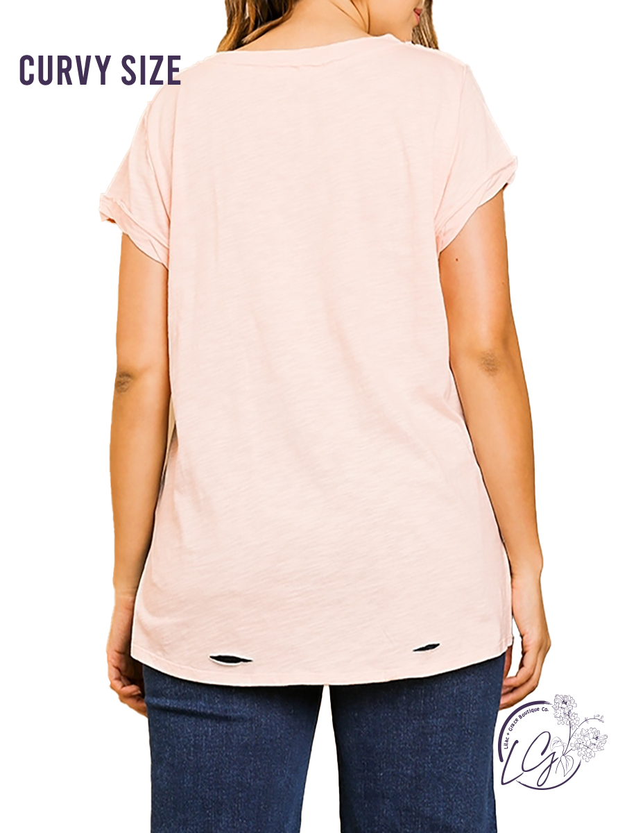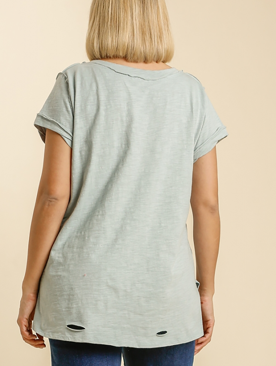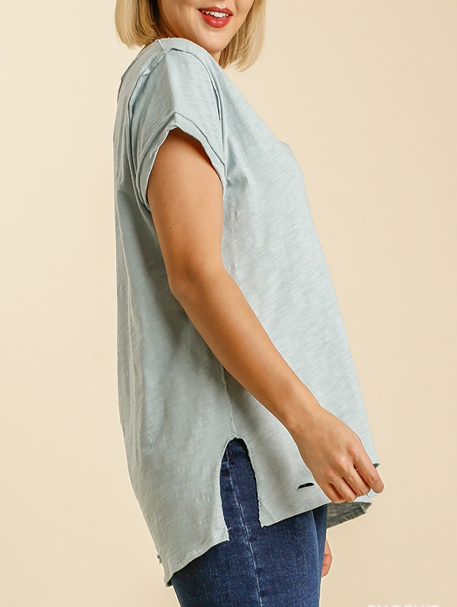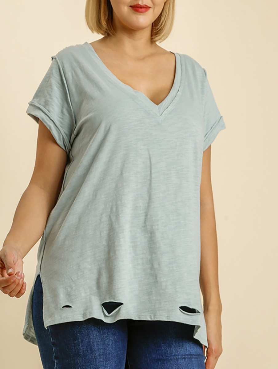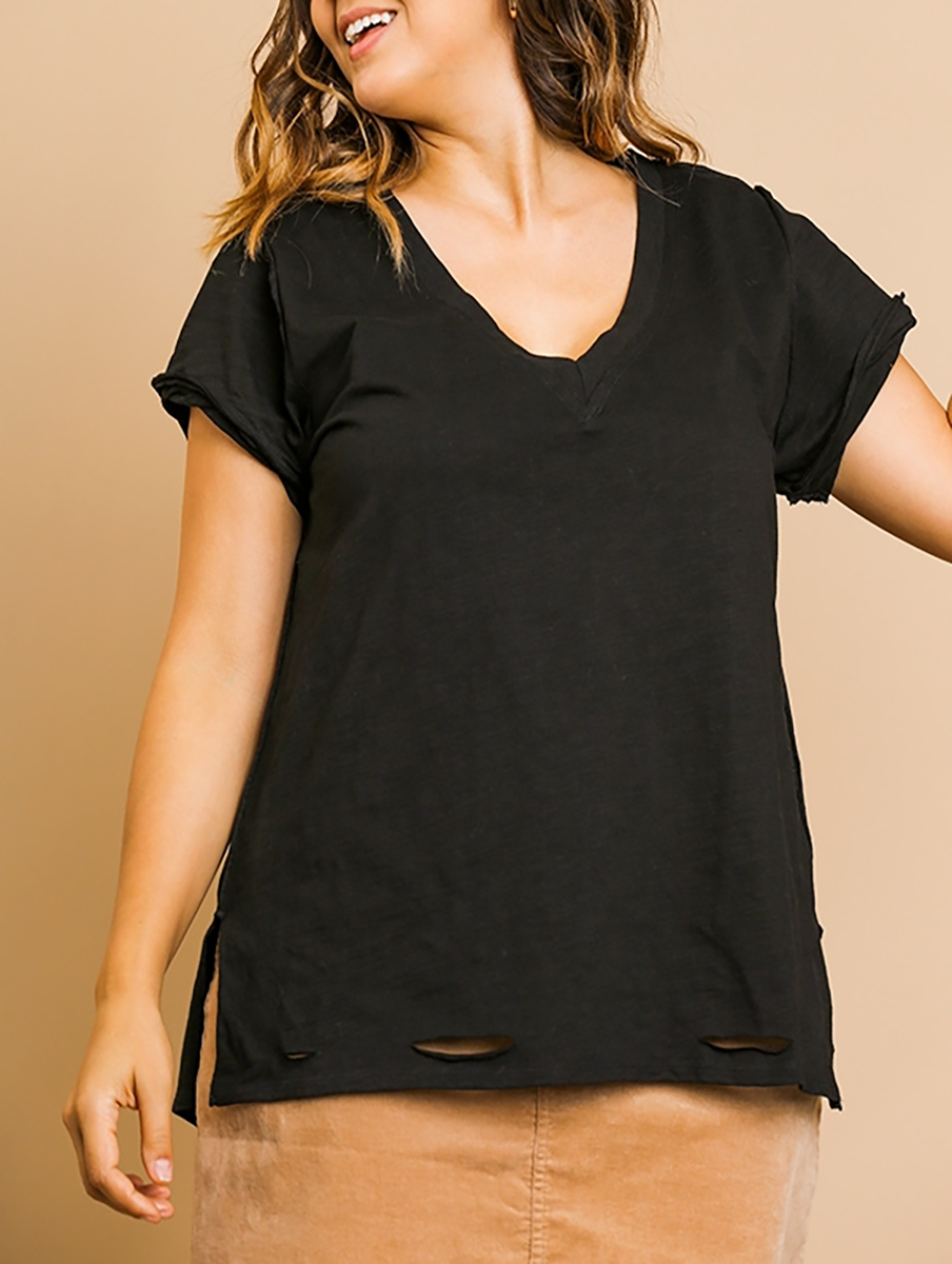 Gathered Short Sleeve V-Neck Knit Top with a Distressed Hem and Side Slits