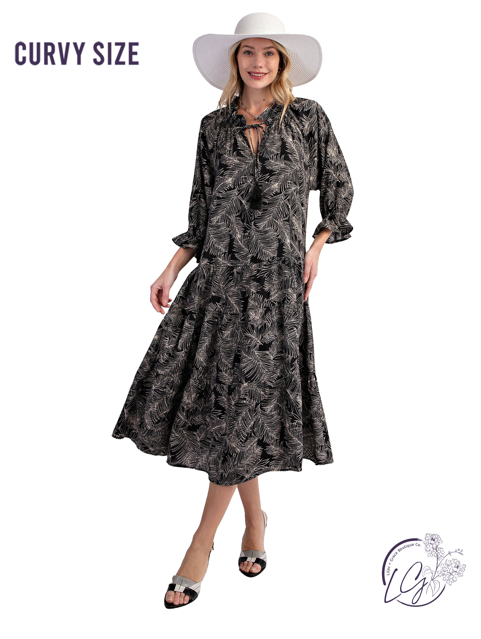Elevate your wardrobe with the Curvy Feeling pretty good Maxi Dress! The leaf print cotton poplin fabric creates a flowy, relaxed silhouette, while the v-neck with ruffle detailing adds a touch of femininity. Tassel ties, 3/4 sleeves, and smocked cuffs complete the look. Convenient pockets and a tiered, ruched bottom make this dress both stylish and practical!