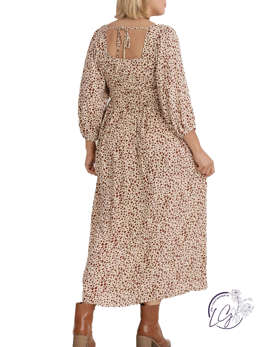 Curvy Animal Print Square Neckline Half Sleeve Smocked Maxi Dress with Back String Tie and Pockets
