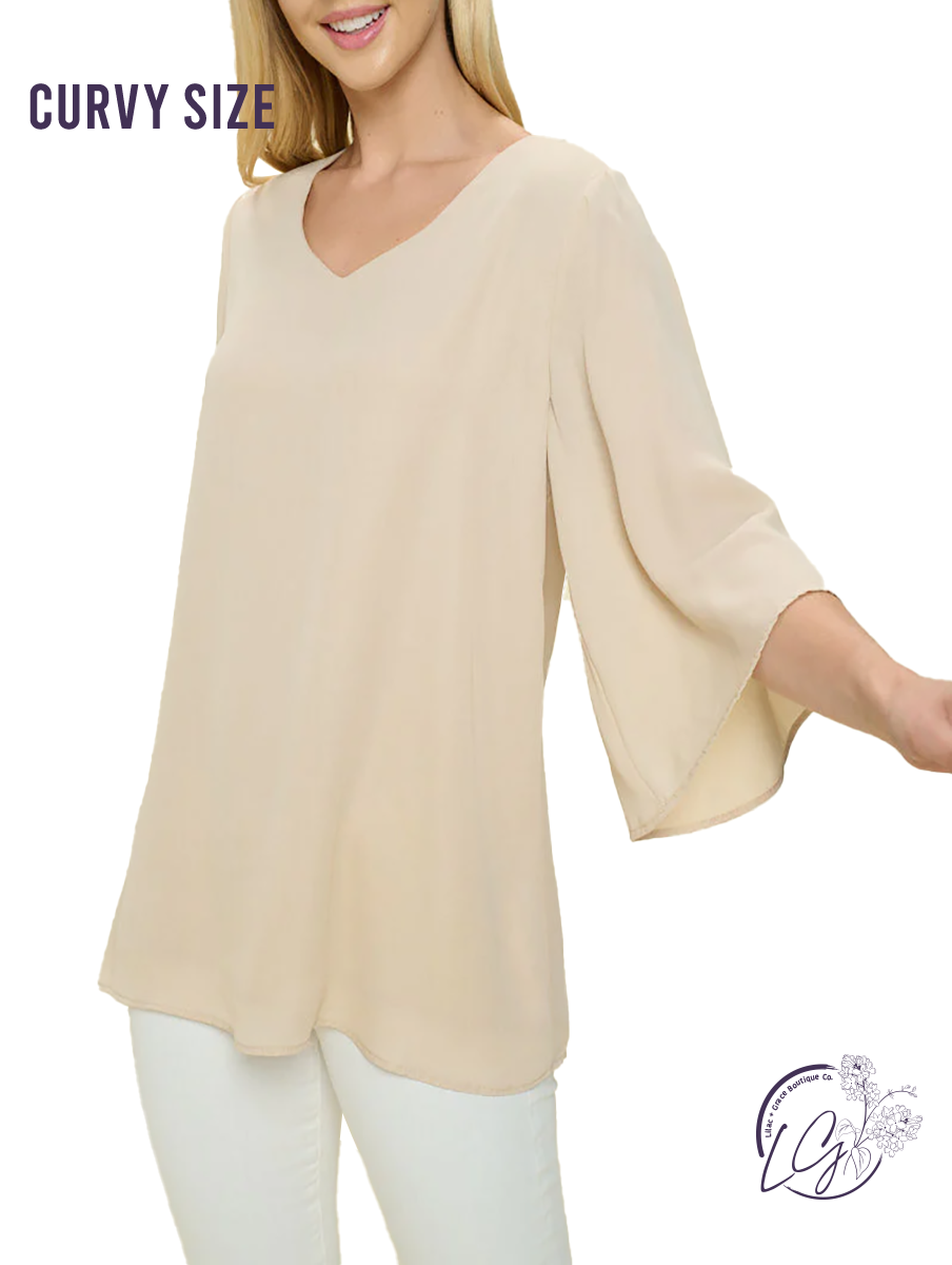 Curvy Double layer wide sleeve v-neck dressy blouse Wool Dobby