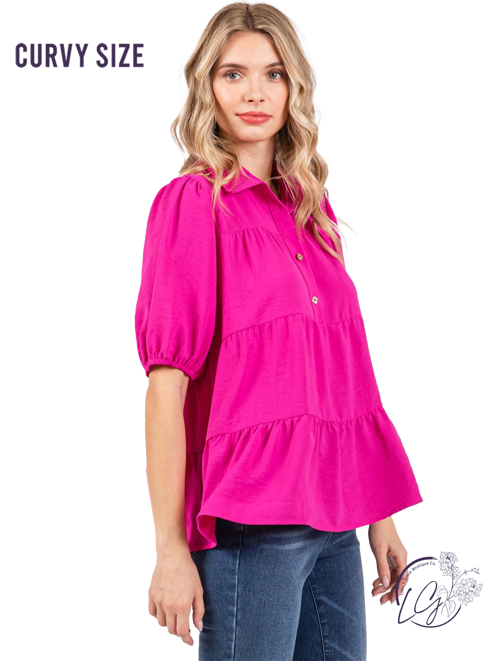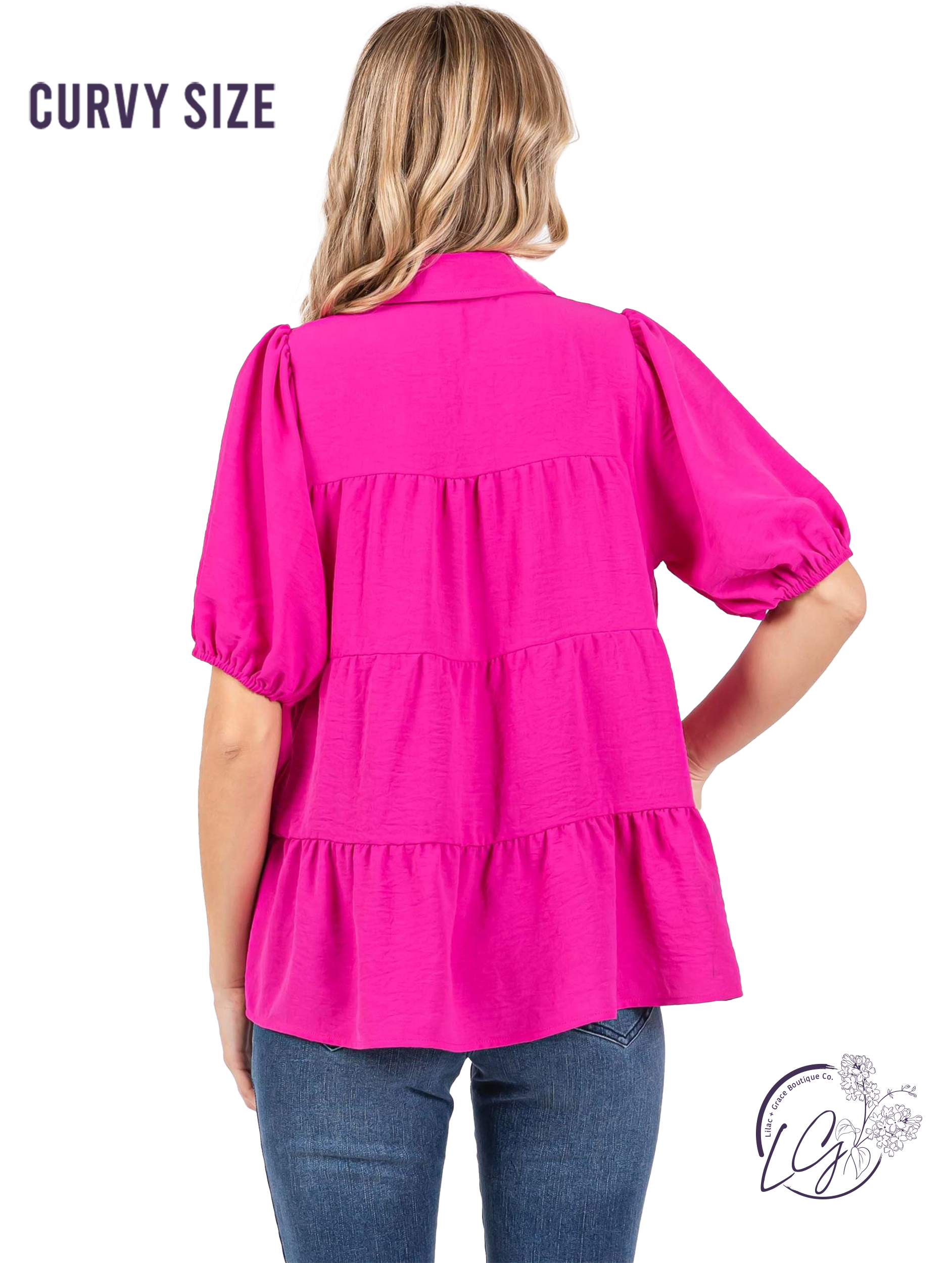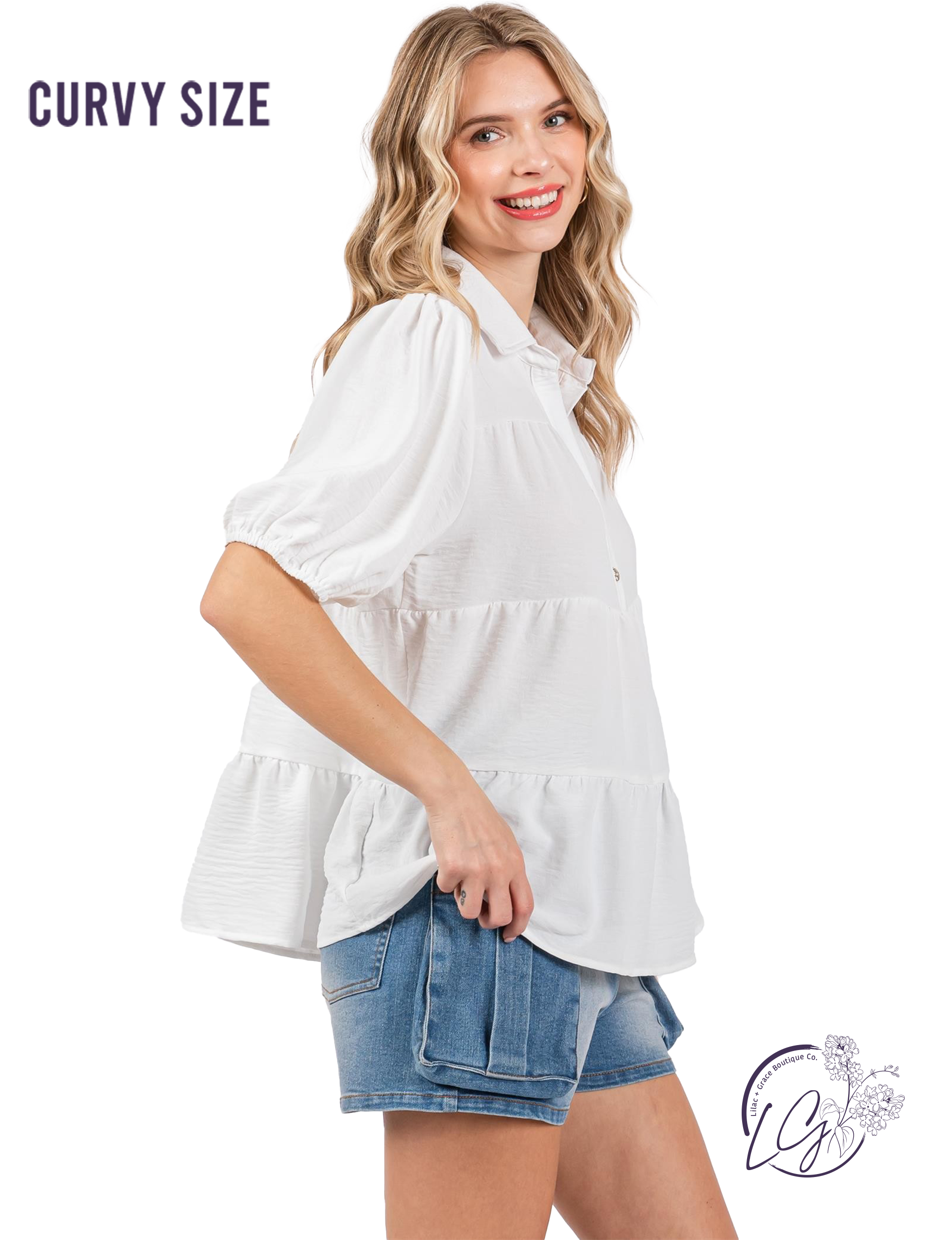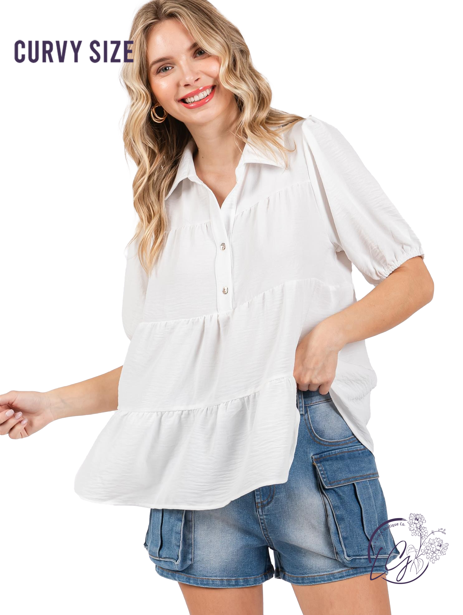 Upgrade your wardrobe with our Graceful Gather Puff Sleeve Top. Featuring a classic collared button front and tiered design, this top is perfect for daily wear. The Air Flow technology ensures maximum comfort while the elastic cuffs and half puff sleeves add a touch of whimsy. Looking good has never been so easy (or comfy)!
