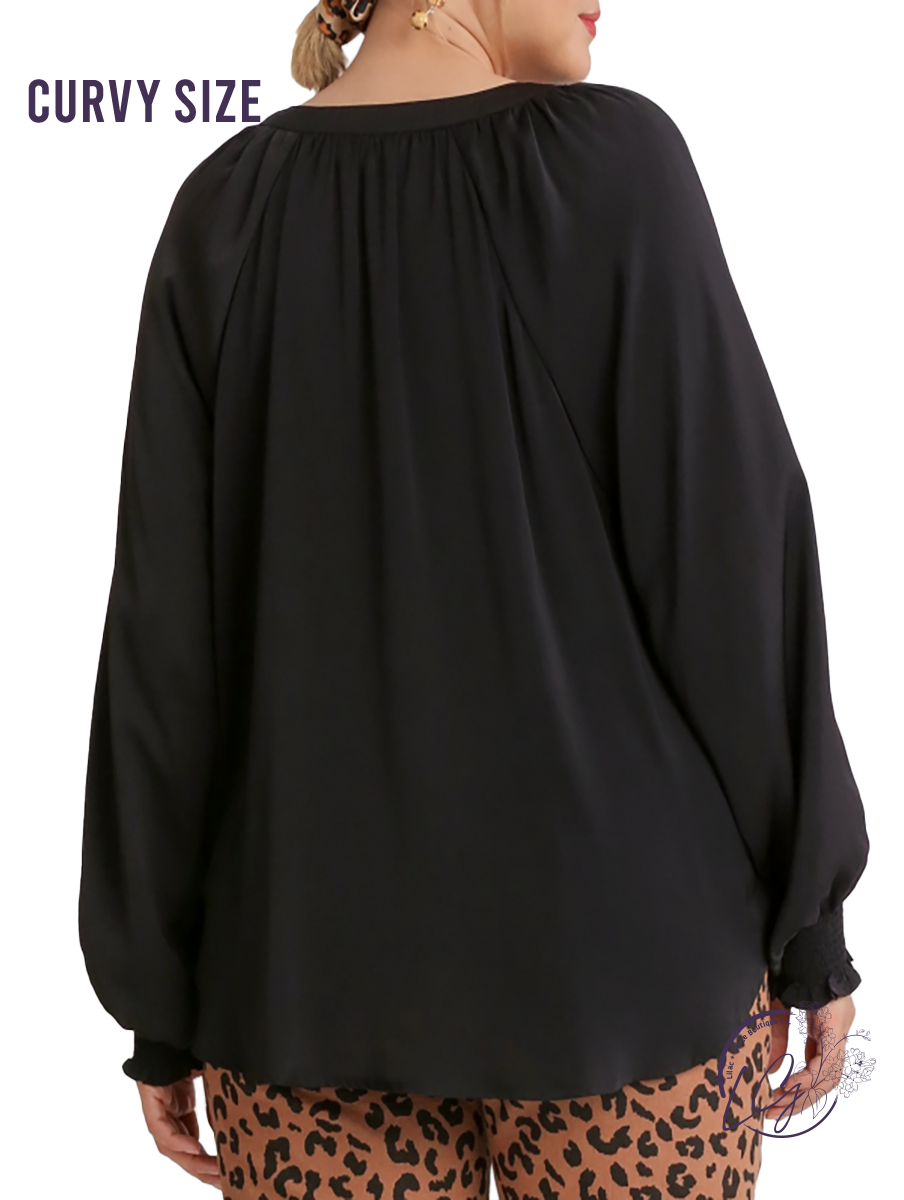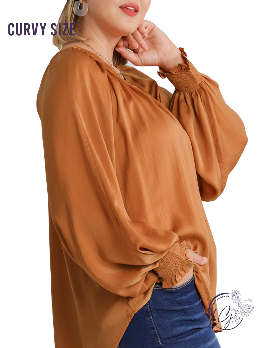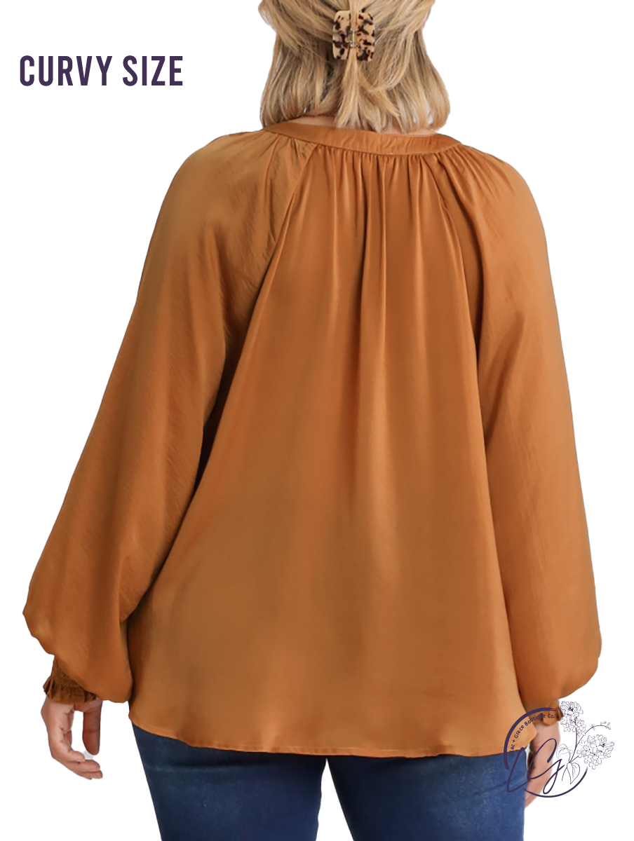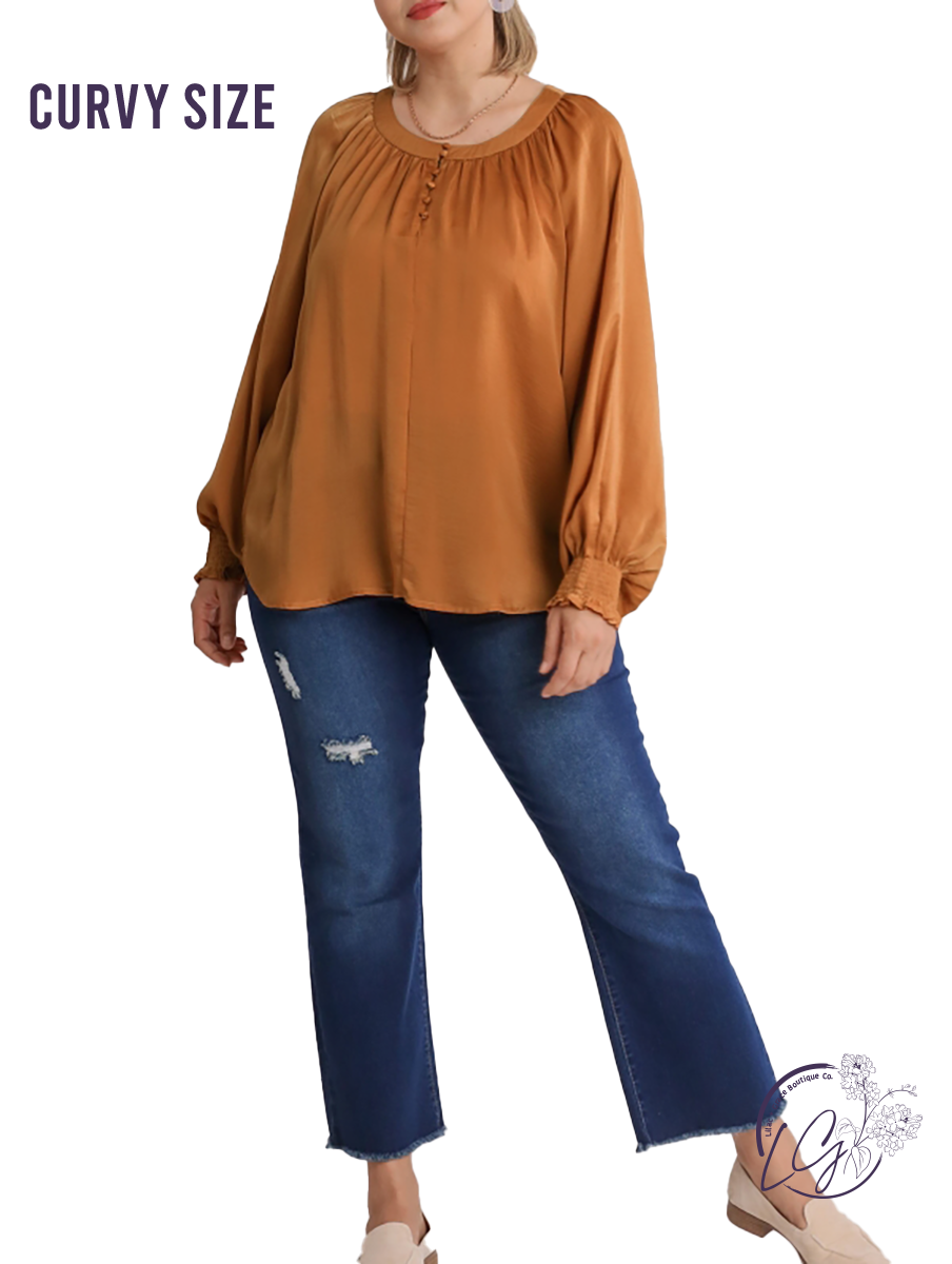 Curvy Washed Satin Round Neck Button Front Long Puff Sleeve Top with Smocked Cuff Detail