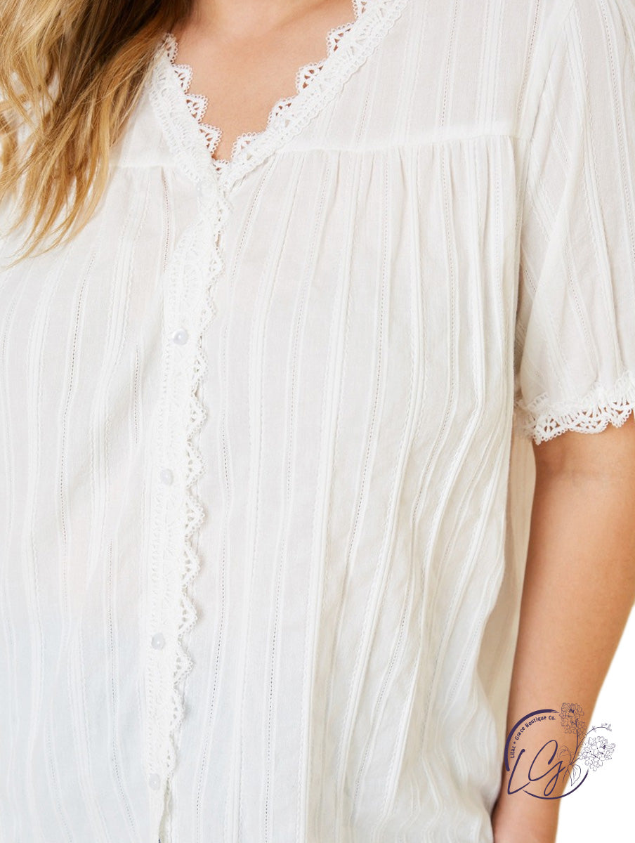 Indulge in the timeless elegance of the Curvy Lace Embrace Button-Up Top—a garment that seamlessly merges sophistication with a touch of elegance. This exquisite piece is a celebration of delicate details and refined design.