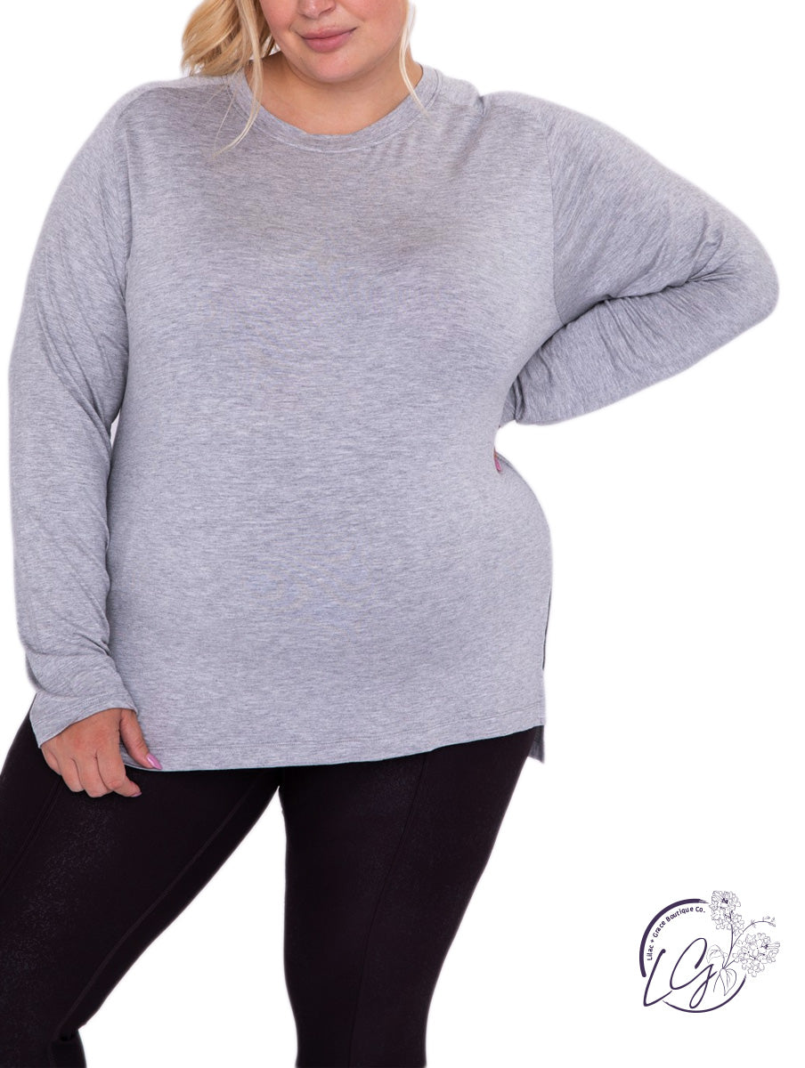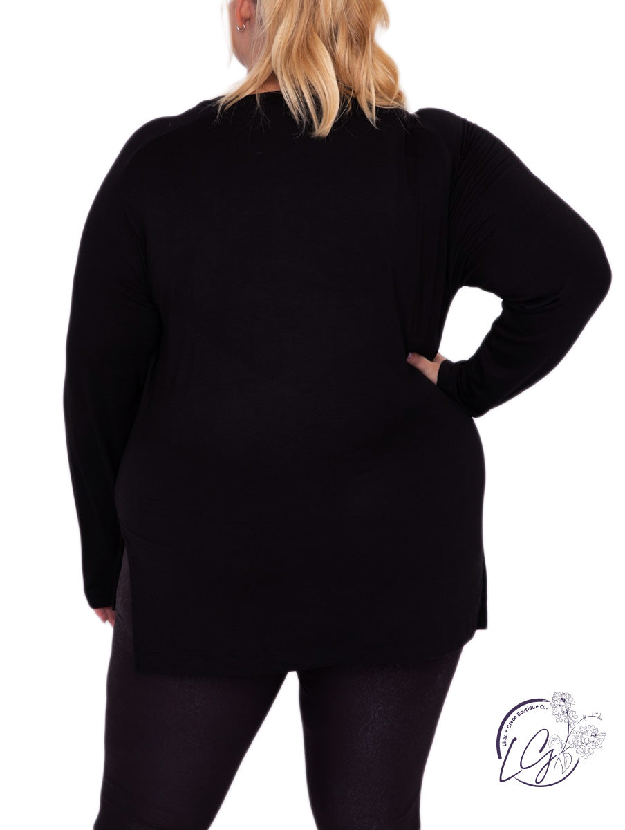 This long sleeve top is simple and cute with raglan detail and side slits for added mobility!