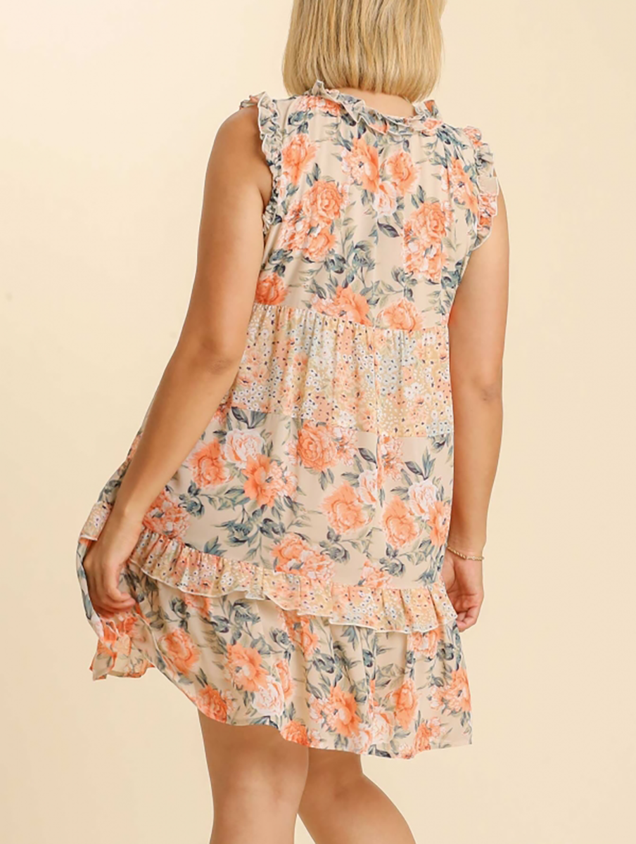 Mixed Floral Print Split Neck Ruffle Trimmed Sleeveless Tiered Dress with Lining