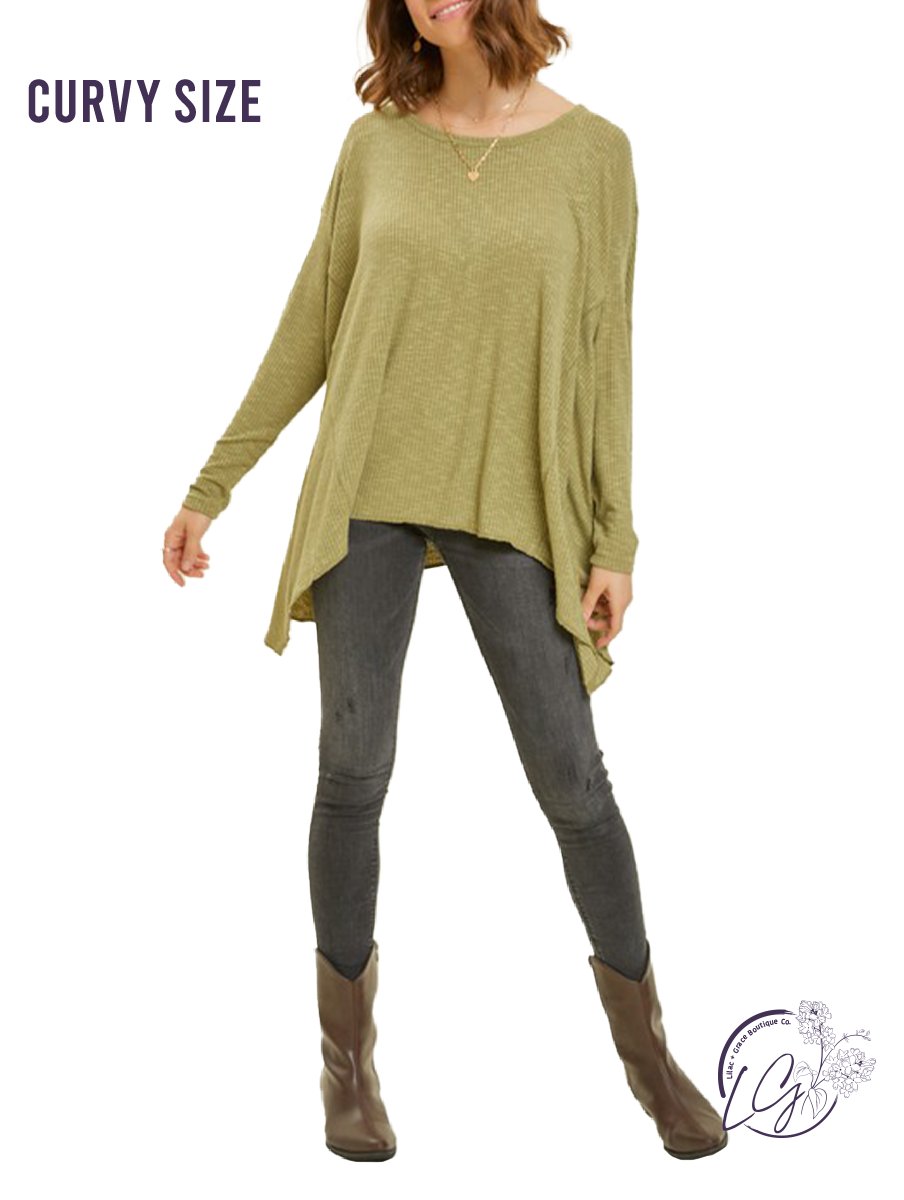 Introducing the "Curvy Mellow Mosaic Rib Layer Top," a luxurious and oversized addition to your wardrobe that seamlessly combines comfort with contemporary style. Crafted from super-soft ribbed fabric, this layering top is designed to cocoon you in a cloud of coziness.