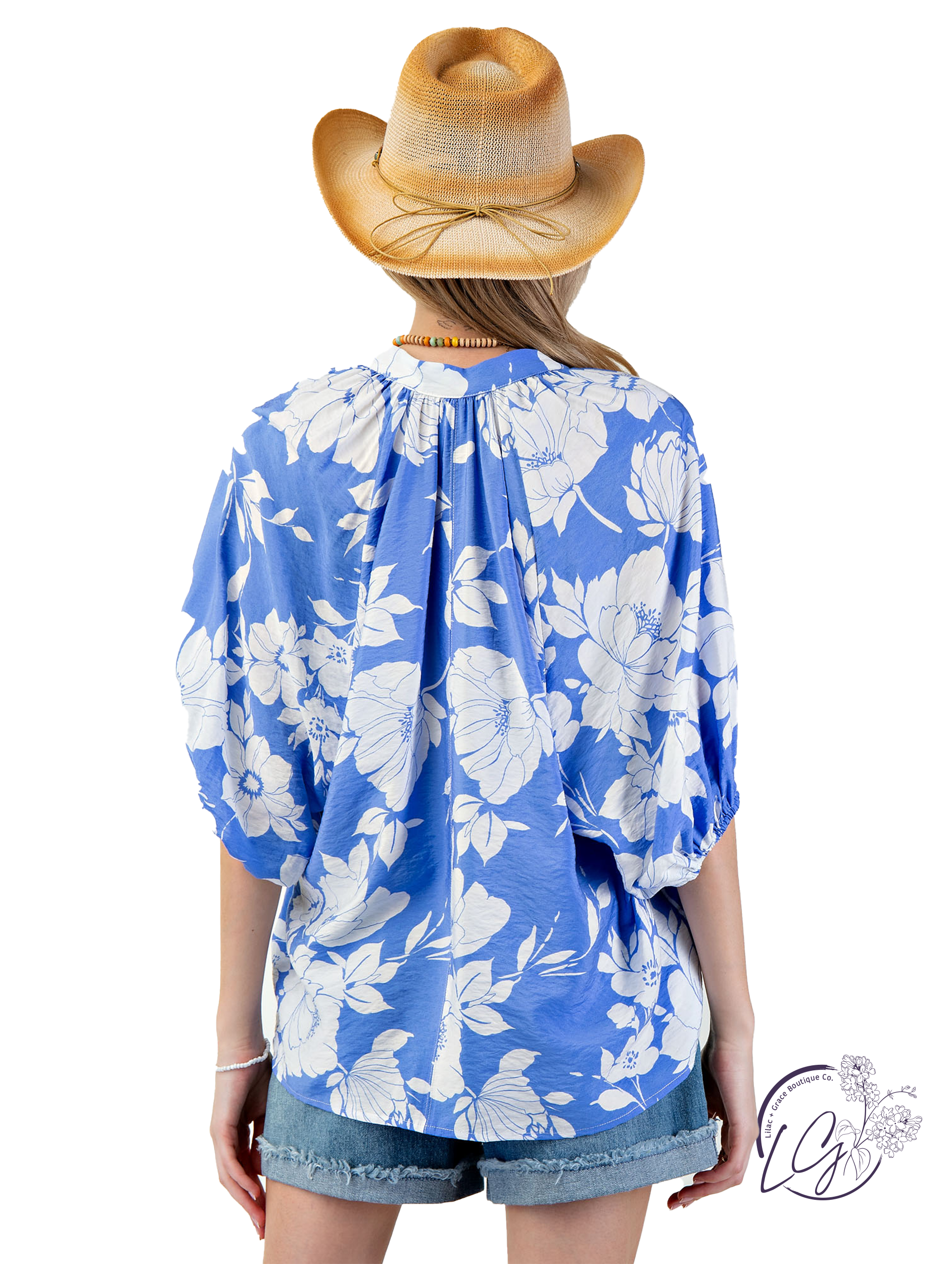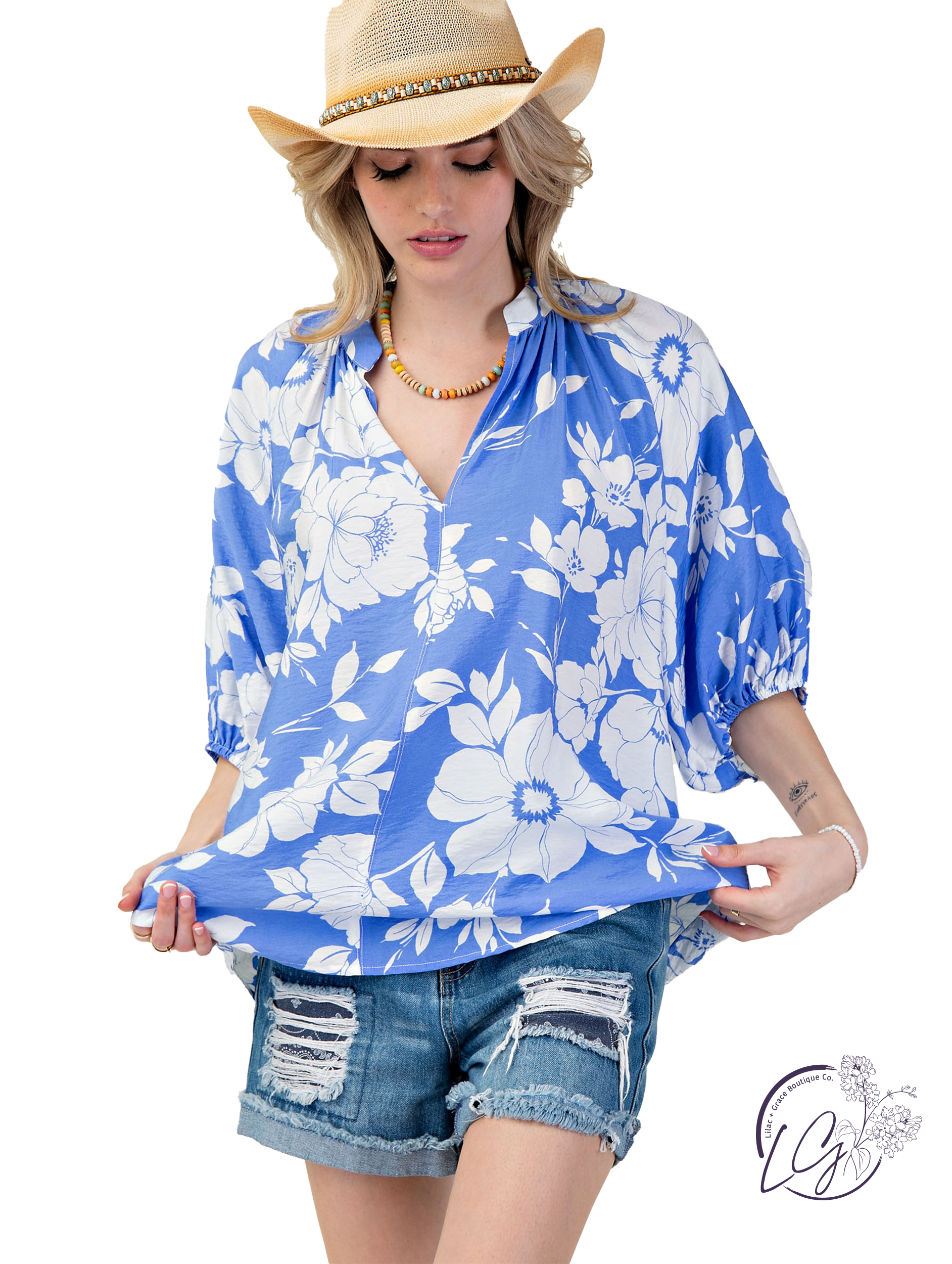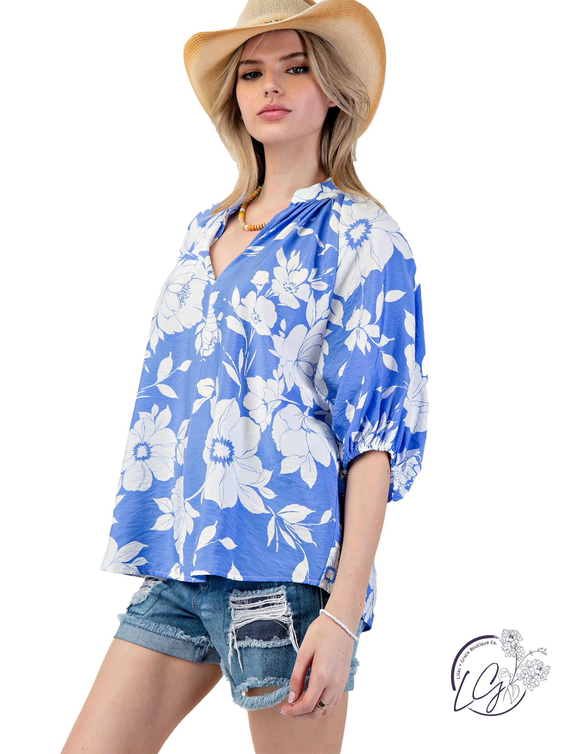 This printed Tencel woven top features a notched and ruched v-neckline, 3/4 puff sleeves with cinched ends, and a soft floral print throughout. Crafted from lightweight fabric, it offers a relaxed, loose fit perfect for warm, easygoing days.