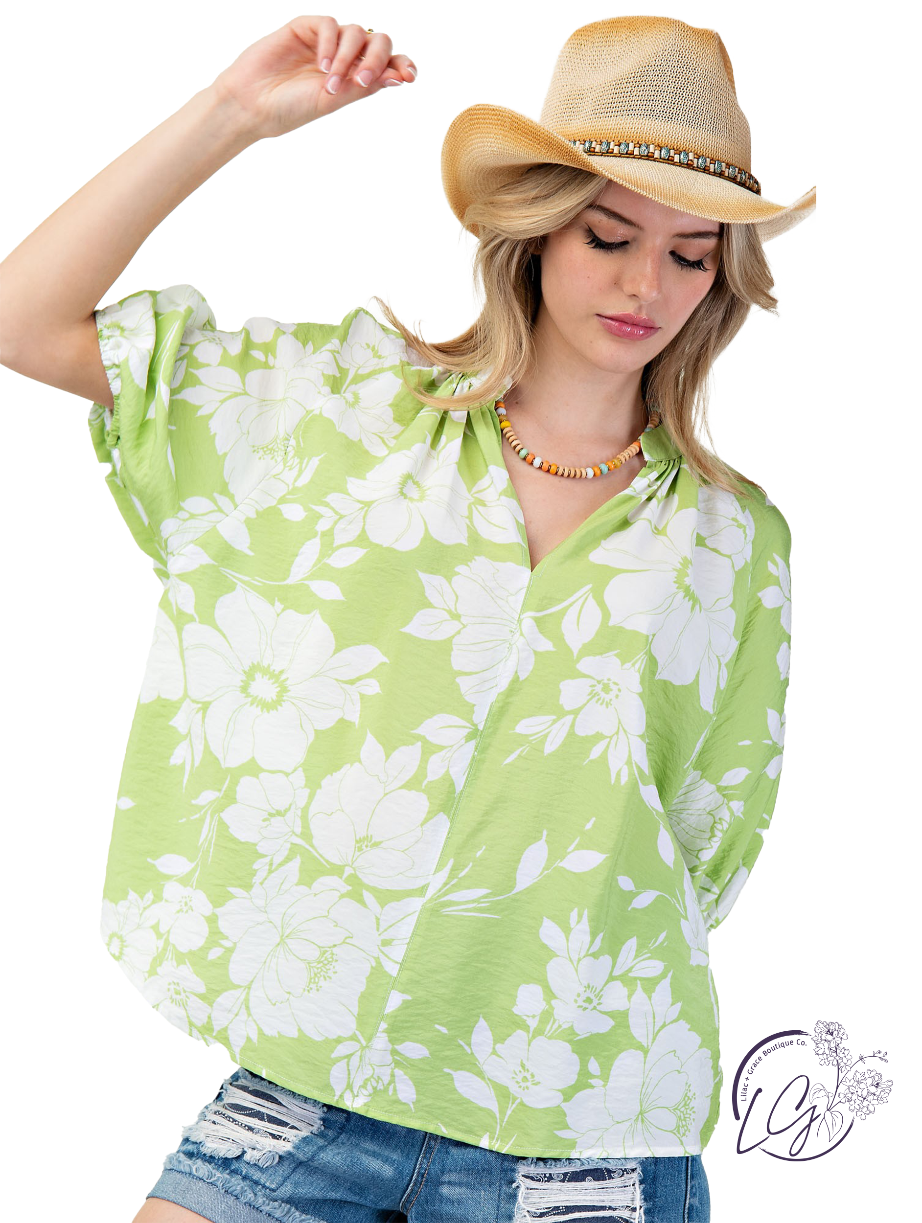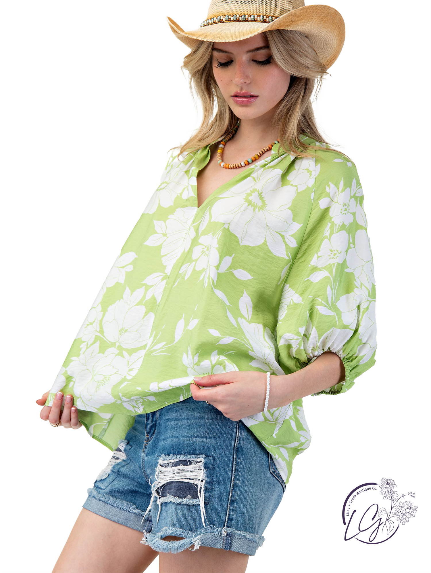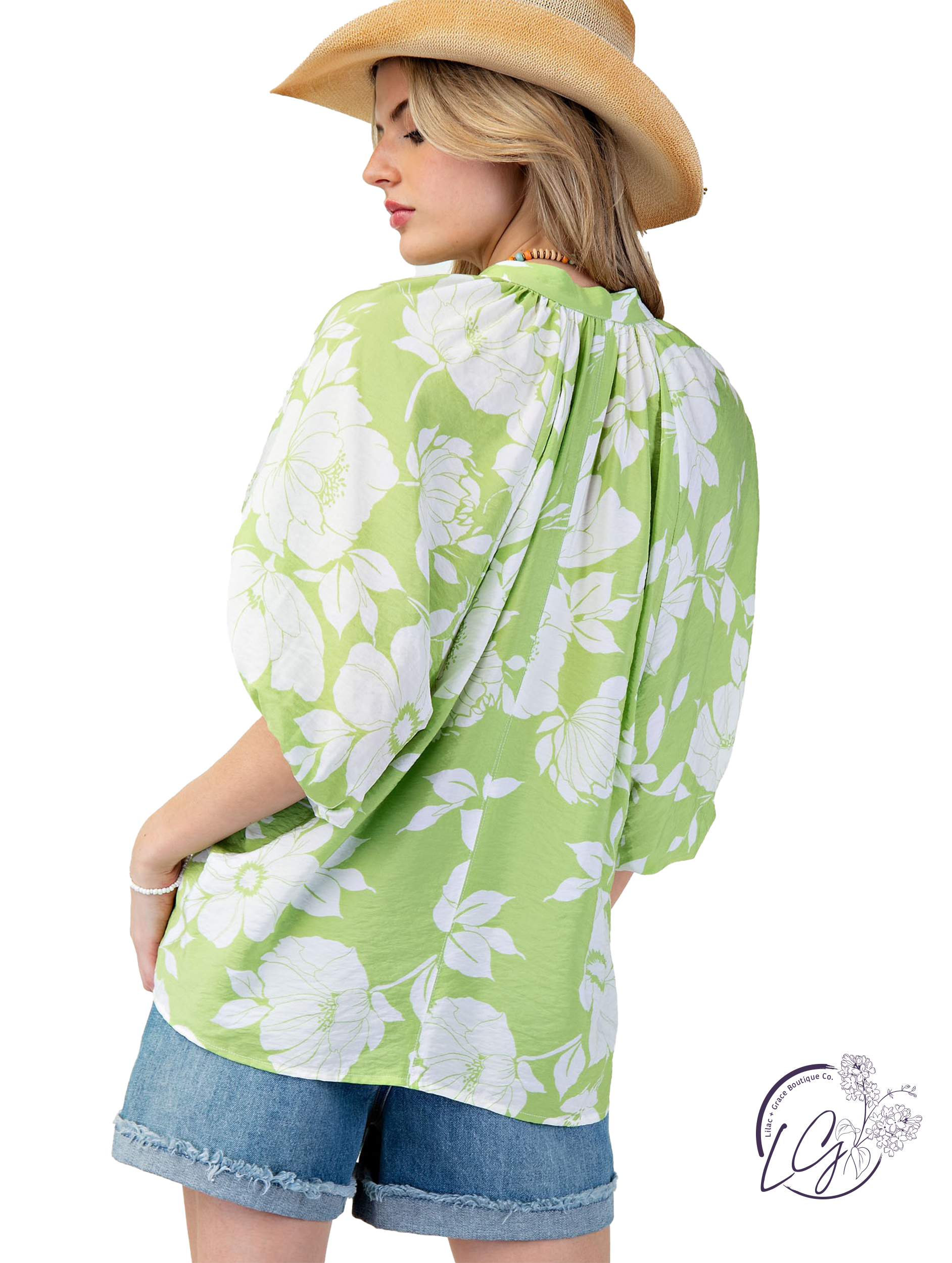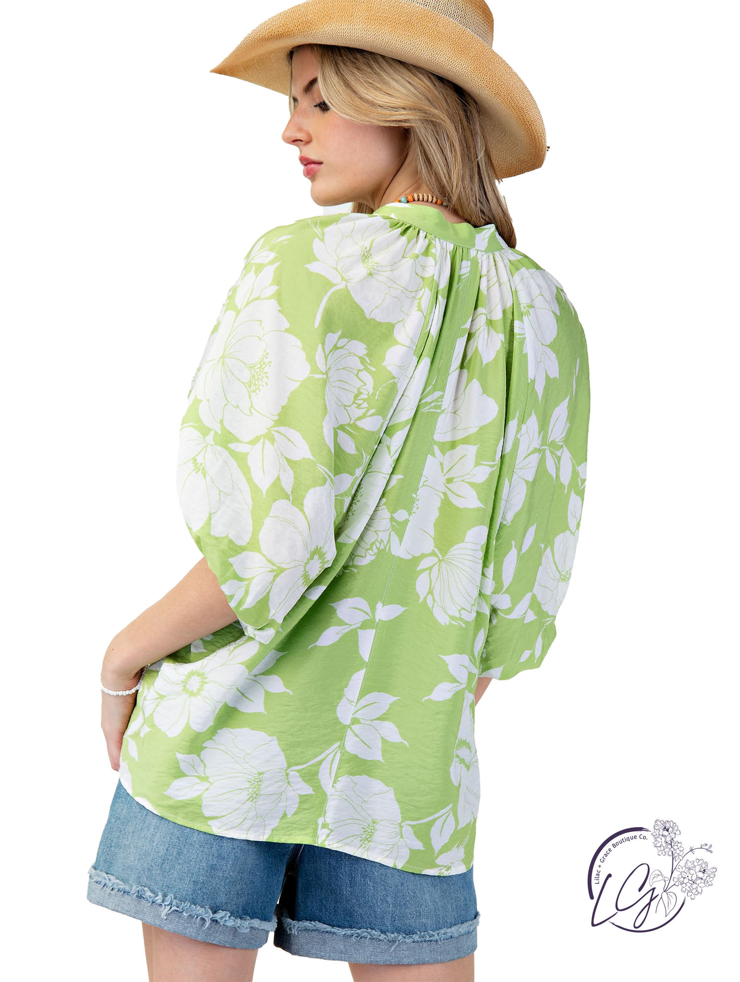 This printed Tencel woven top features a notched and ruched v-neckline, 3/4 puff sleeves with cinched ends, and a soft floral print throughout. Crafted from lightweight fabric, it offers a relaxed, loose fit perfect for warm, easygoing days.