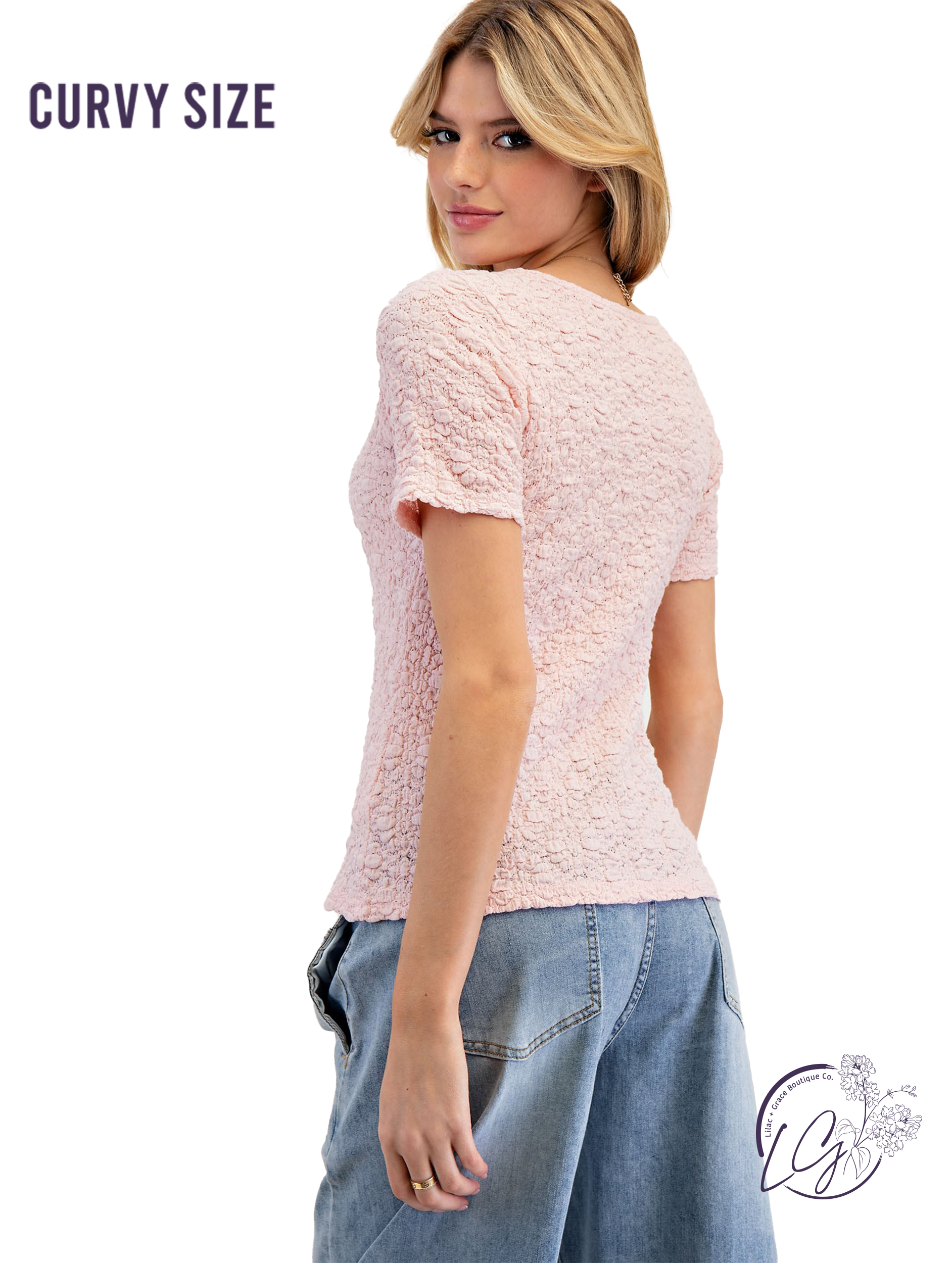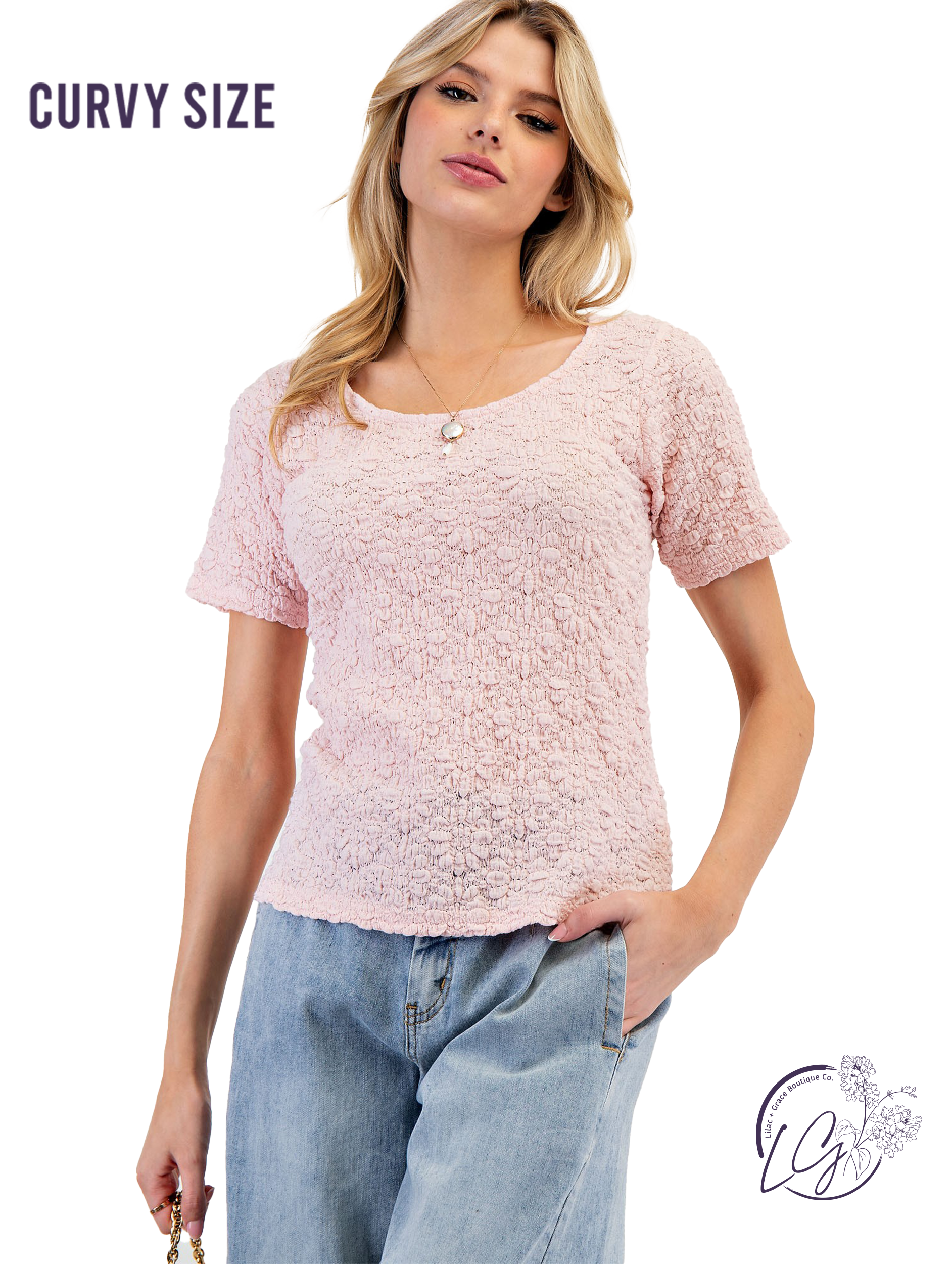 This allover lace top features a form-fitting silhouette with a rounded neckline and short sleeves, crafted from a textured lace fabrication that’s slightly sheer for a delicate, layered look.