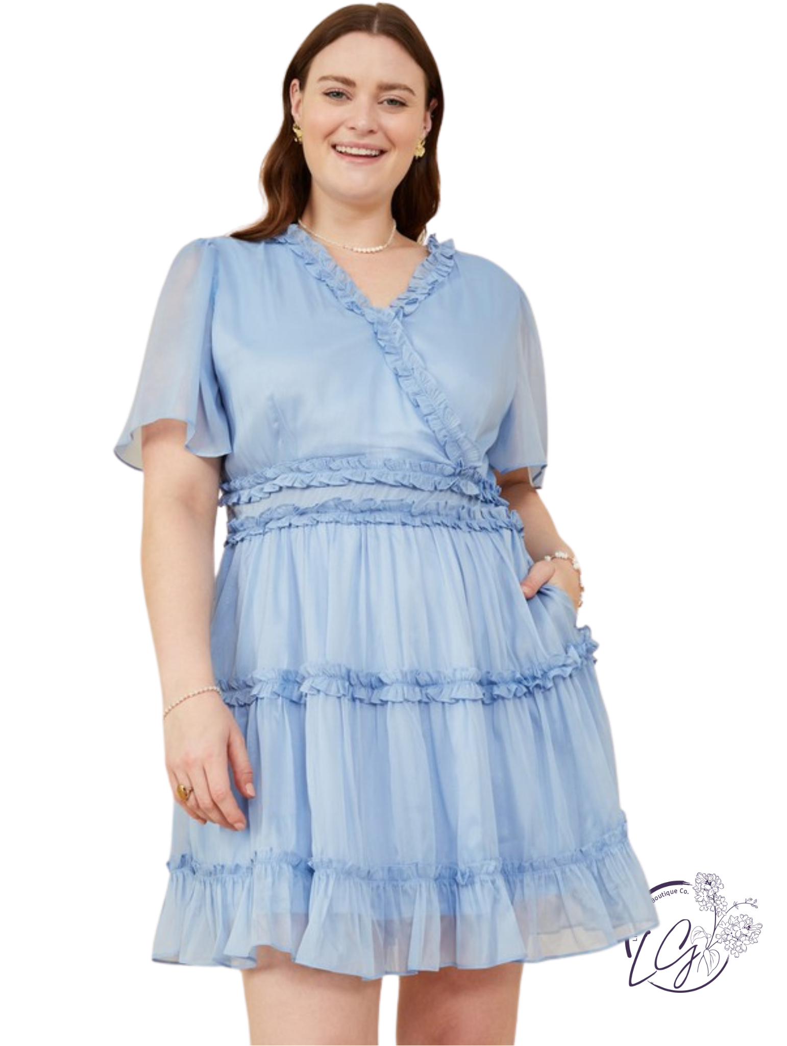 This surplice dress features airy woven organza with delicate ruffle detailing for an elegant, floaty feel. The V-cut neckline adds a flattering touch, while the fully lined interior ensures comfort and coverage.