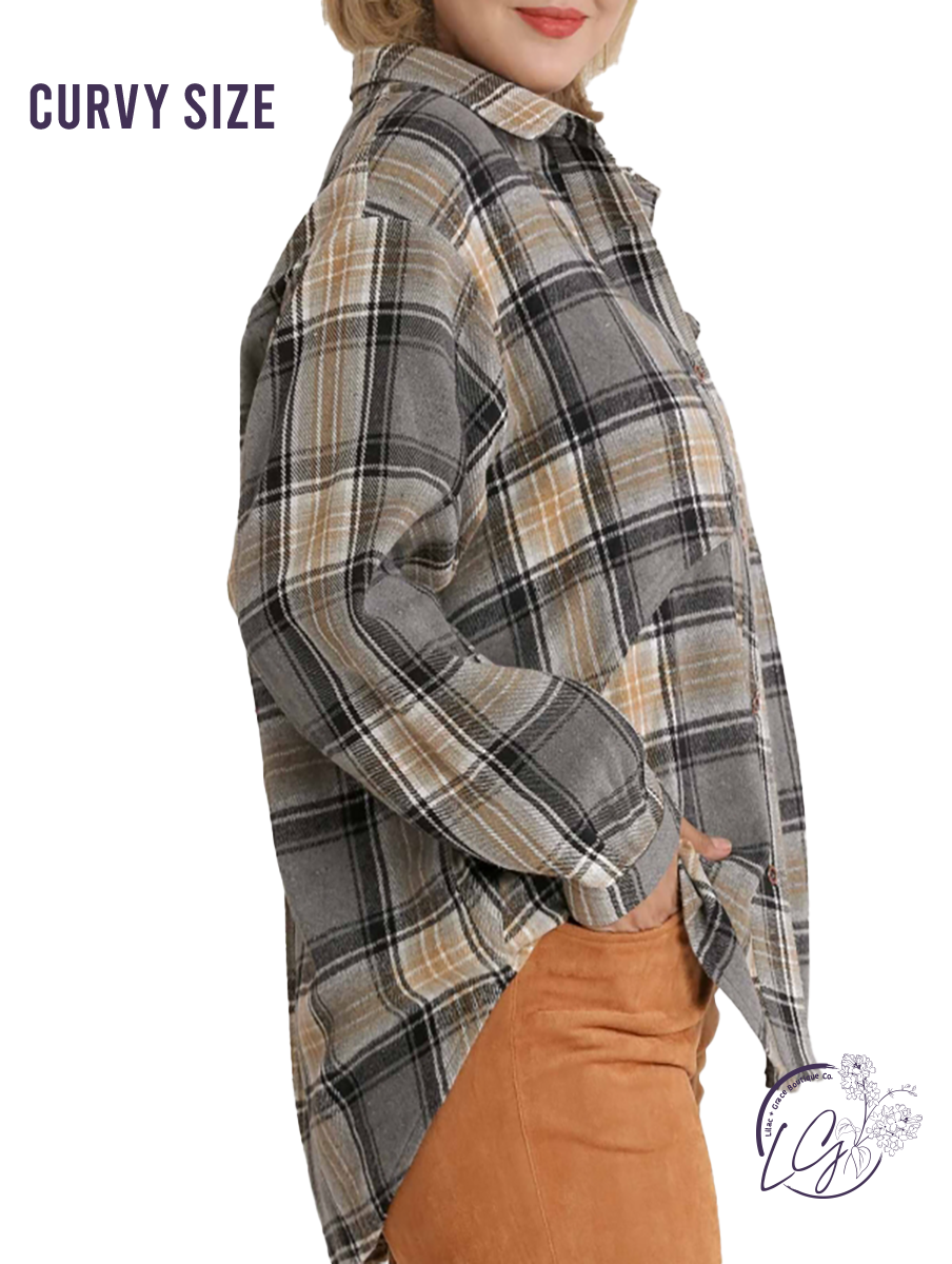 Curvy Plaid Collar Button Down Shacket with Front Pockets