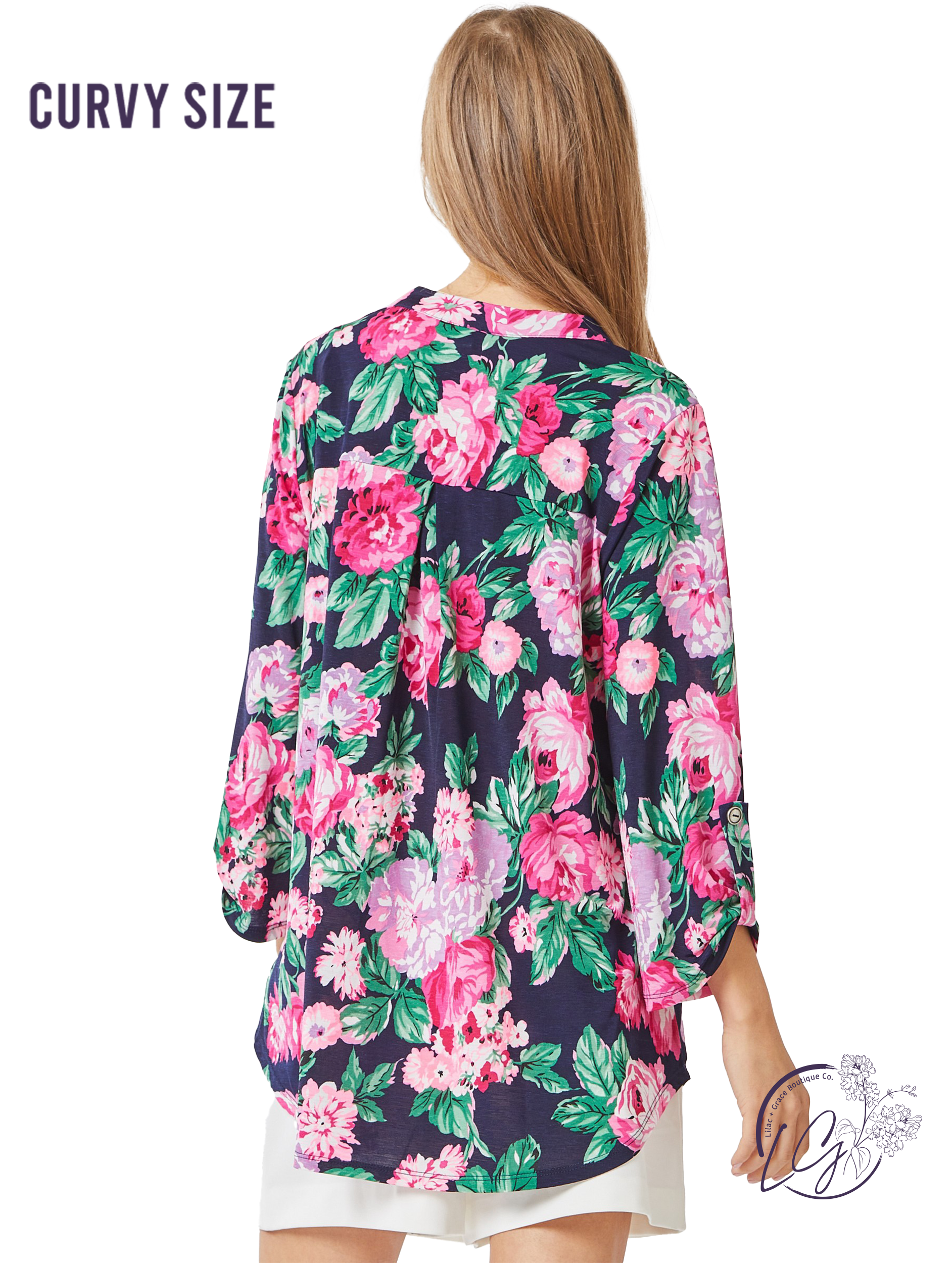 Introducing our signature Lizzy top! Made with a luxurious poly blend, this top offers both softness and wrinkle free comfort. Perfect for your busy lifestyle, this travel-friendly top is cooler than linen and other materials. Features a china collar neckline and 3/4" length sleeves with tab details for a relaxed, flowy fit.