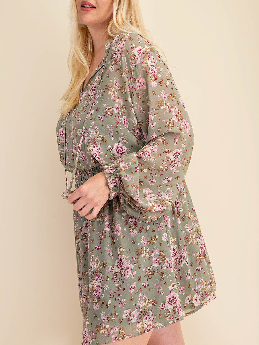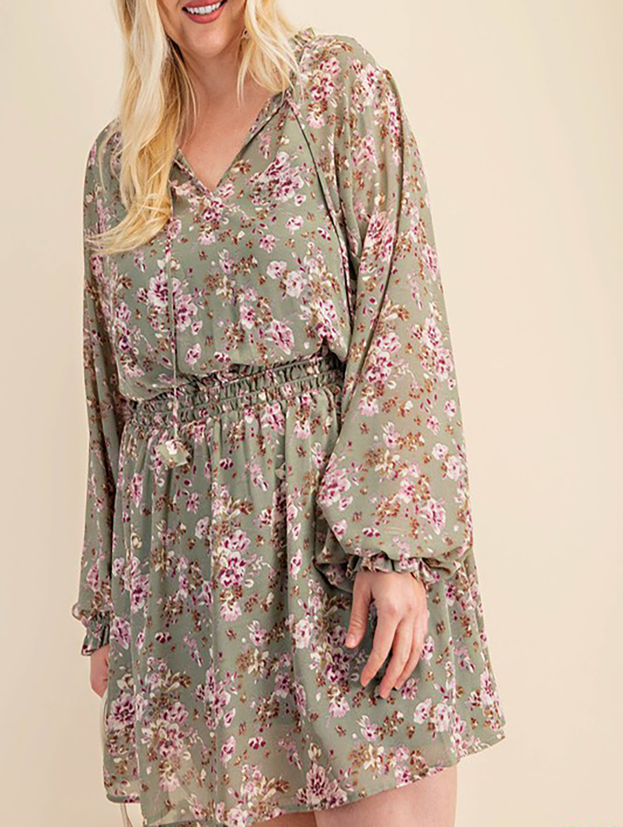 Printed Chiffon Fabric Smocked Waist Long Sleeve Dress