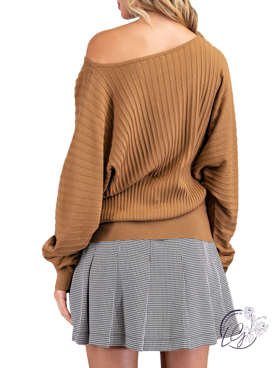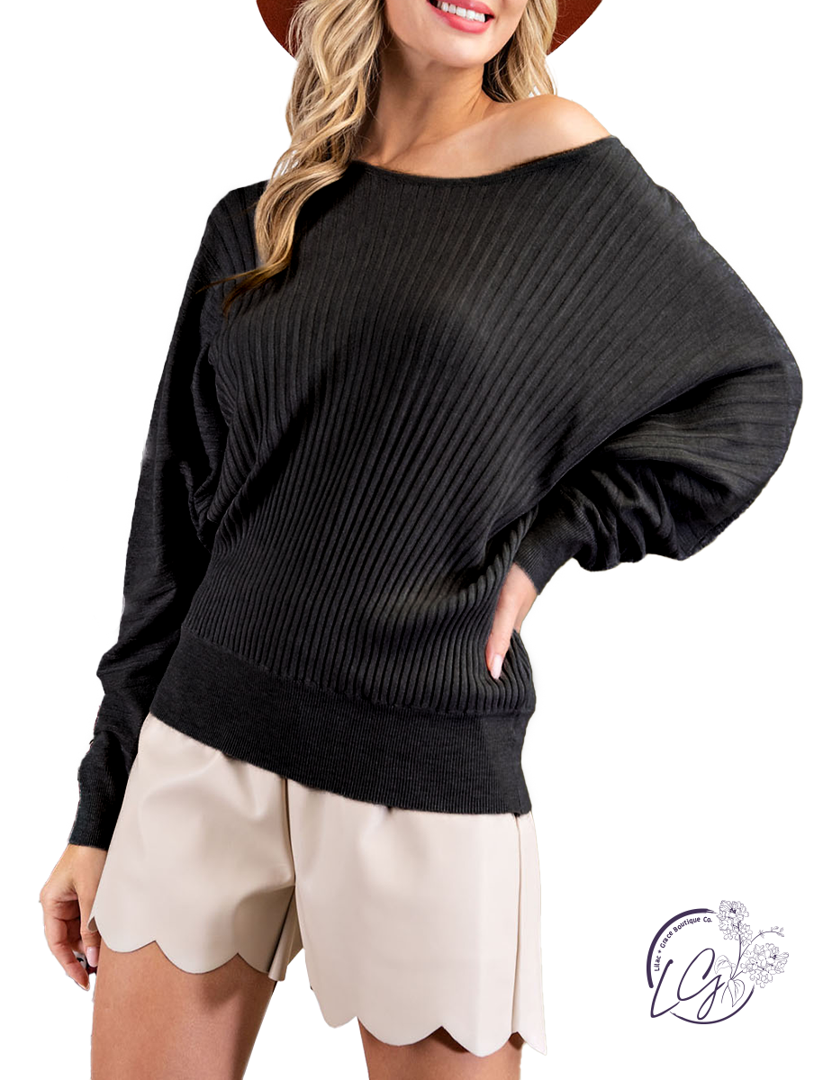 This curvy light weight sweater features a ribbed knit fabric and long dolman sleeves. Wear with an off the shoulder look.