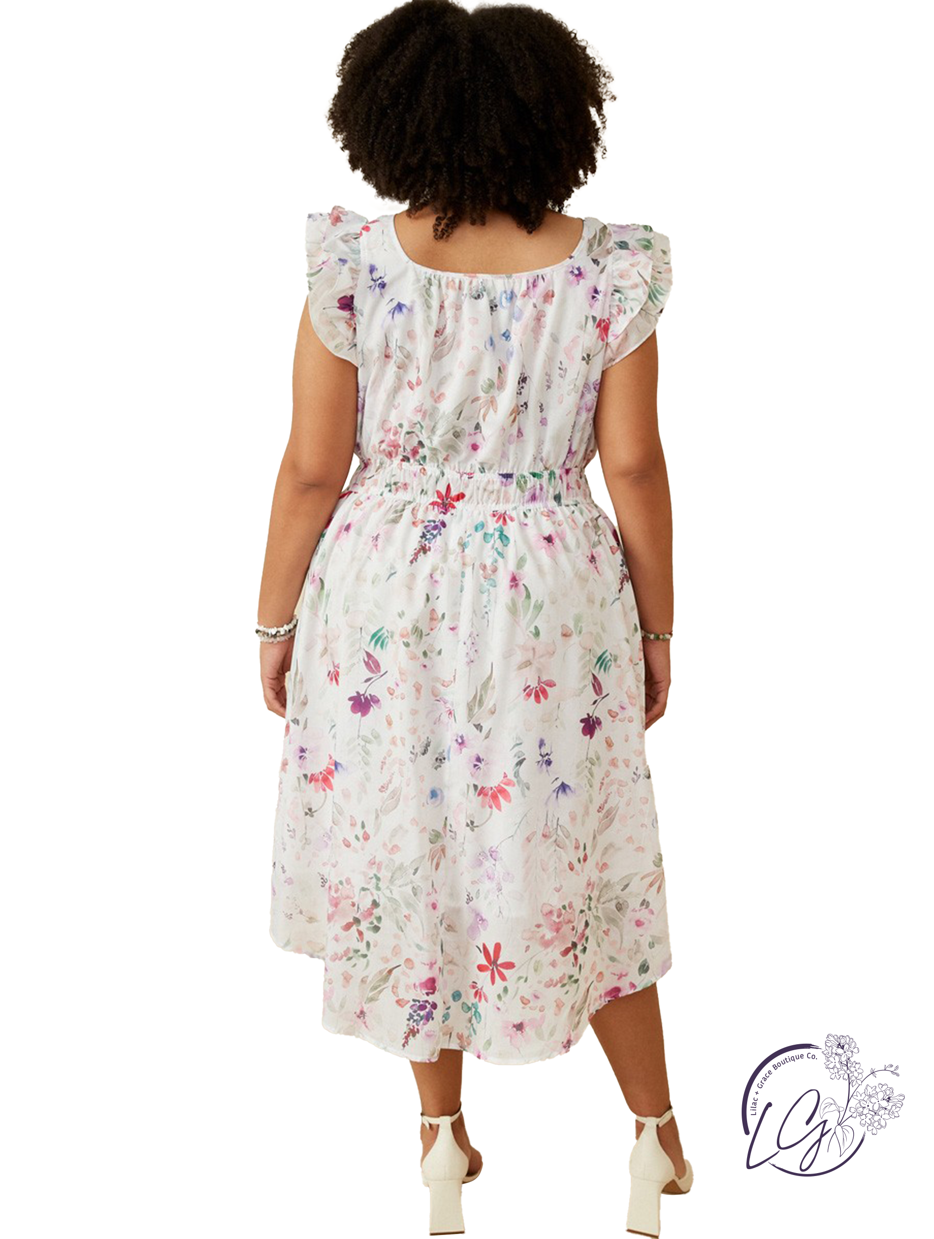 Unleash your inner goddess in our Curvy Paint The Sky Midi Dress! Made from a delicate floral woven fabric, this dress features elegant ruffle shoulder details that will make you stand out from the crowd. With its dress lining, you'll feel comfortable and confident all day. Elevate your style and paint the sky with this stunning midi dress!