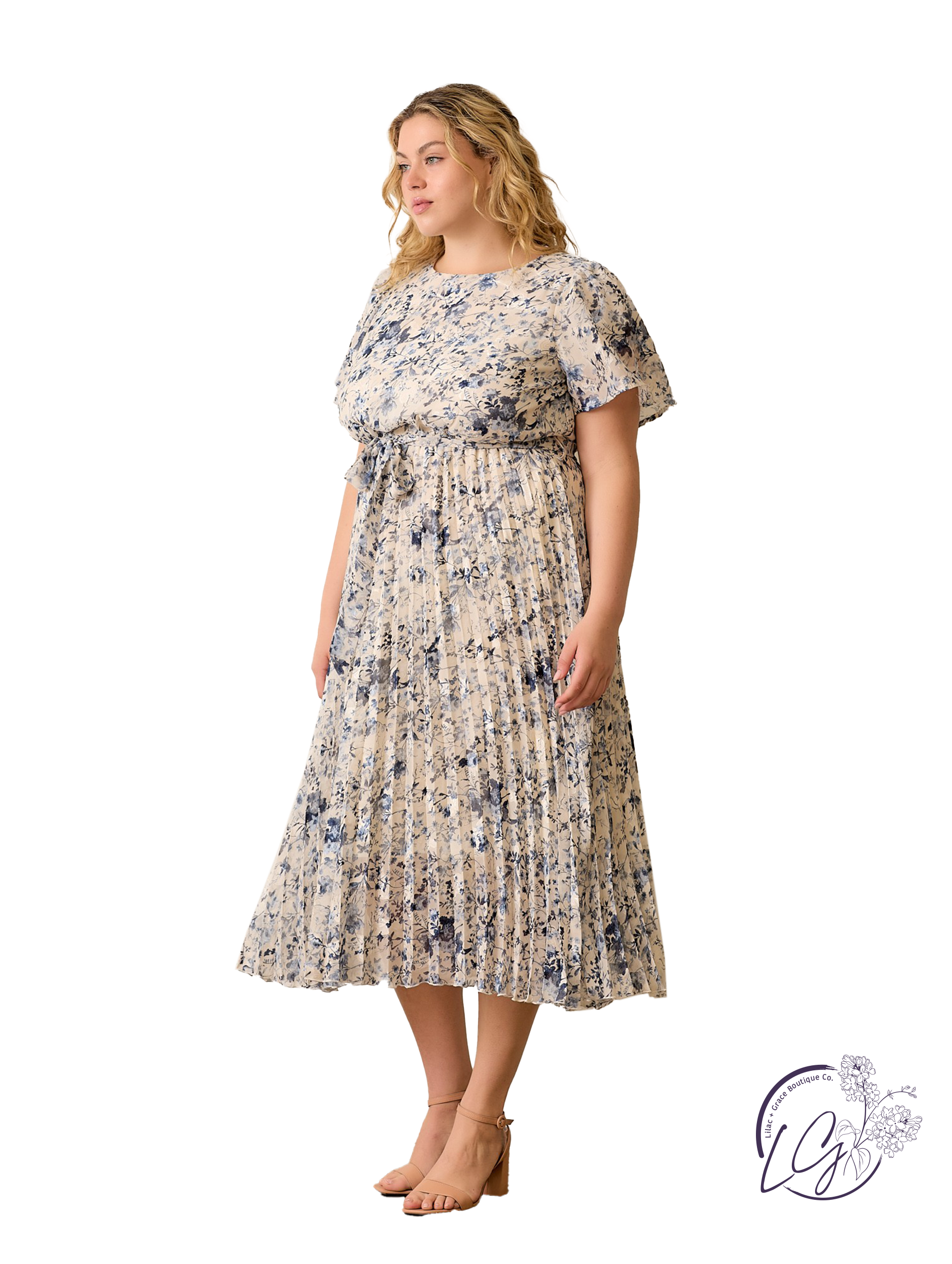 This floral pleated midi dress features a round neckline and short sleeves for a classic, easy-to-wear silhouette. Soft pleats flow through the skirt, creating gentle movement with every step. A front tie detail cinches the waist for a flattering shape, making it perfect for everything from daytime gatherings to evening dinners. Just add simple heels or sandals to complete the look.