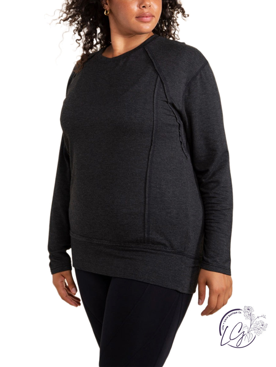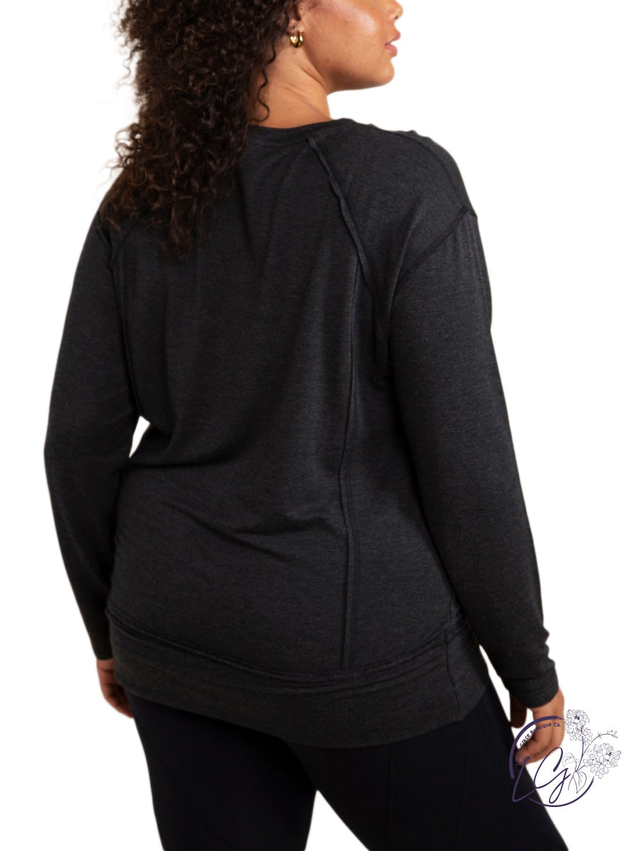We are not kidding when we tell you how extremely soft this top is. Plus, the inner side is brushed for an even more buttery feel. It features long, Raglan sleeves with exposed seams, a wide hem, a round neckline, and a paneled accent on the front and back, just under the Raglan seam lines.