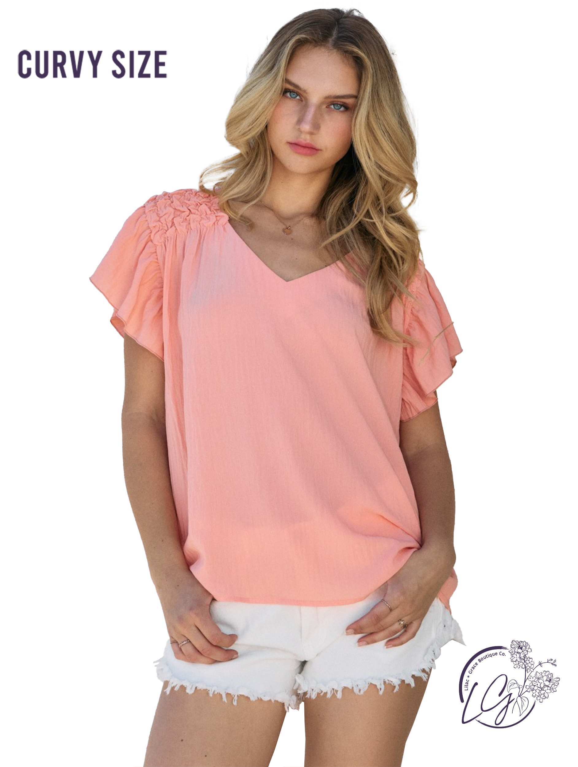 Experience the perfect blend of style and comfort with our Peachy Sunset Glow Blouse! This solid woven blouse features a unique shoulder smocked detail and ruffle short sleeves for a playful yet sophisticated look. Elevate your wardrobe and add a touch of effortless elegance to your outfit.